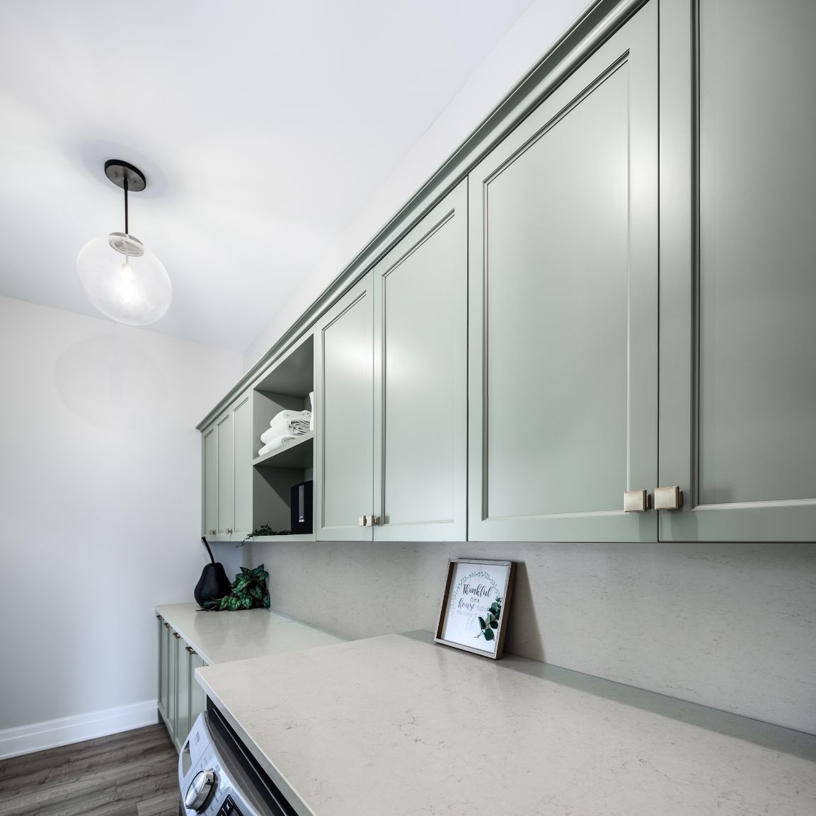 The laundry room cabinets feature Deslaurier's "Northfield" shaker door in MDF adorned with a "Sage" painted finish and paired with pull handles and square knobs for hardware. A light and airy Caesarstone Quartz supplied by Urban Quarry furnishes the countertop surface.