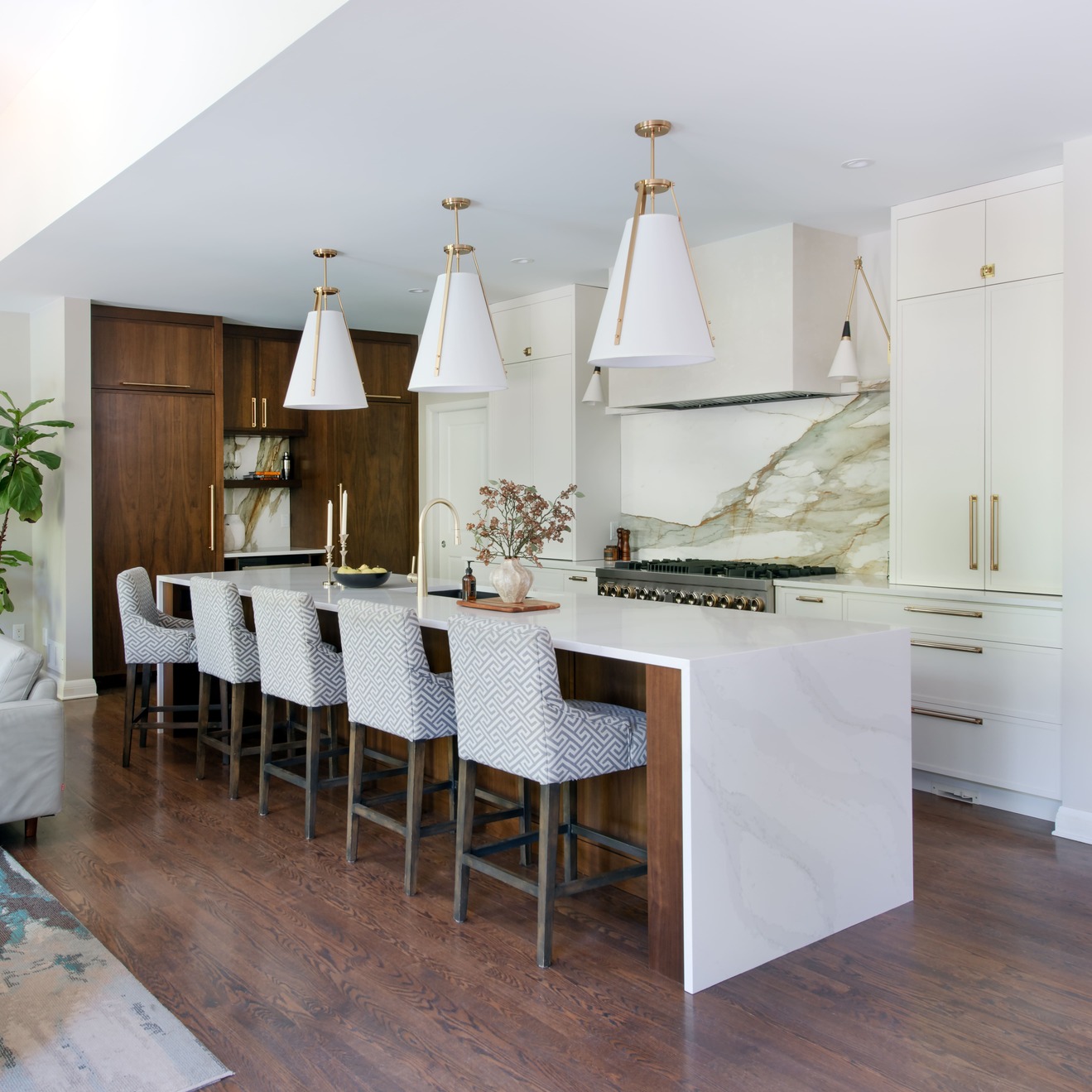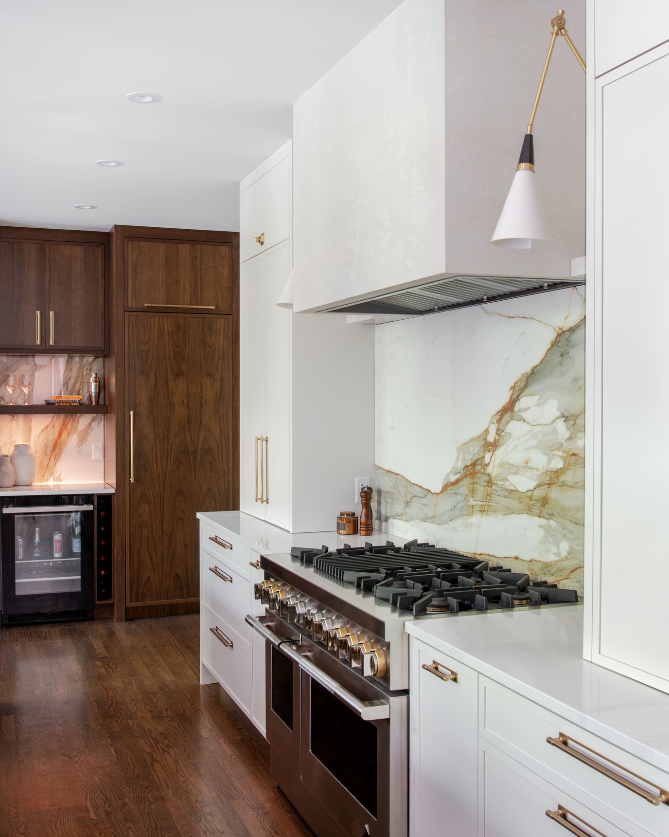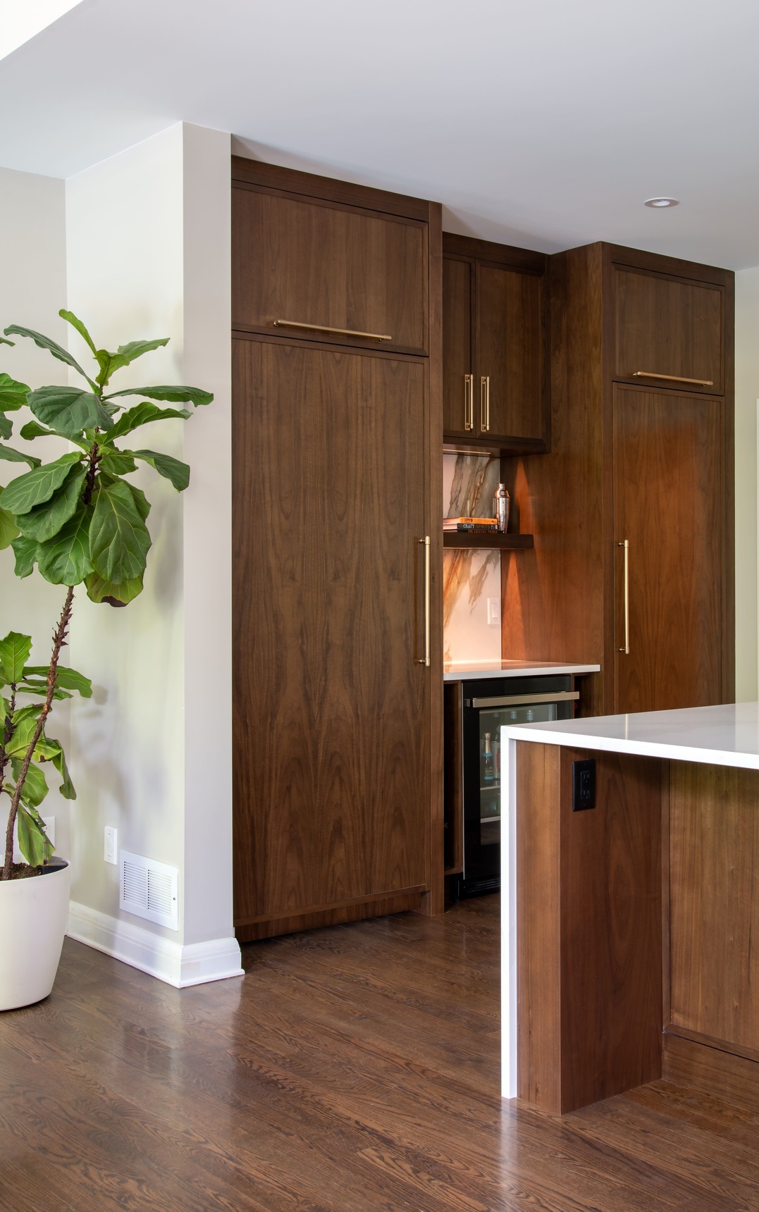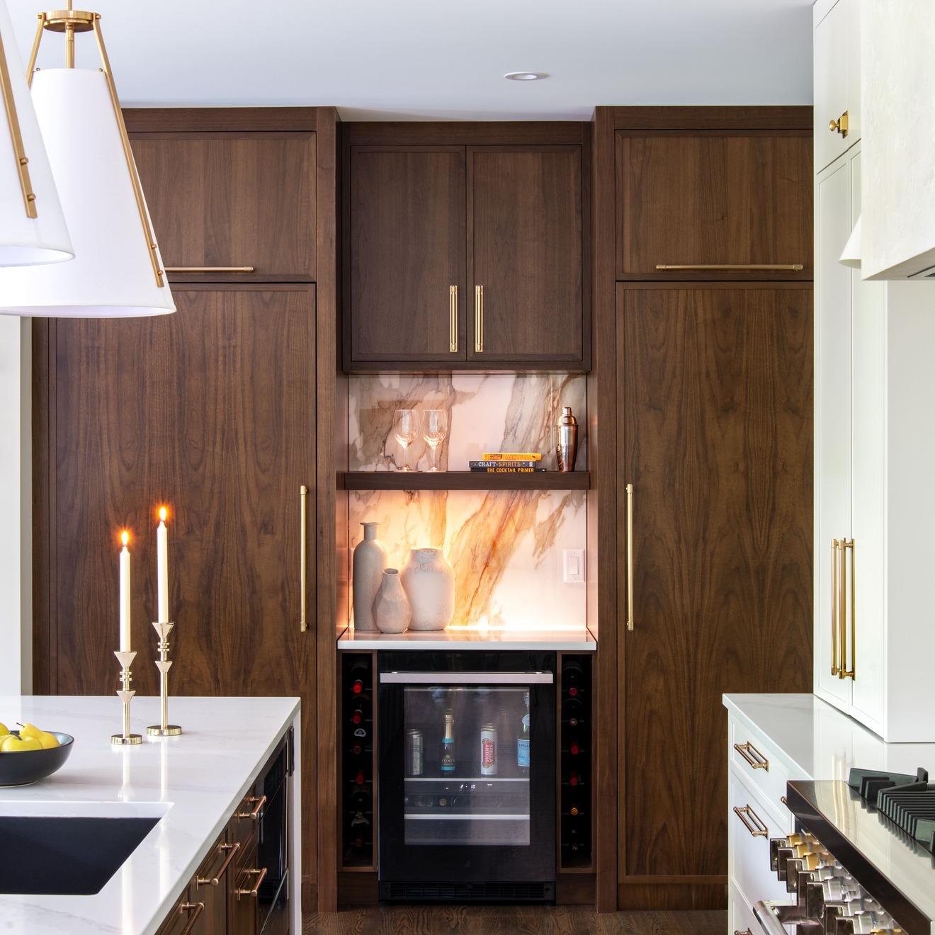 At its core, a stunning walnut island anchors the room, complemented by a matching walnut-paneled fridge and freezer wall for a warm, cohesive look. Paneled luxury appliances and a two-tone cabinetry scheme—enhanced by elegant brass hardware—add depth and sophistication.