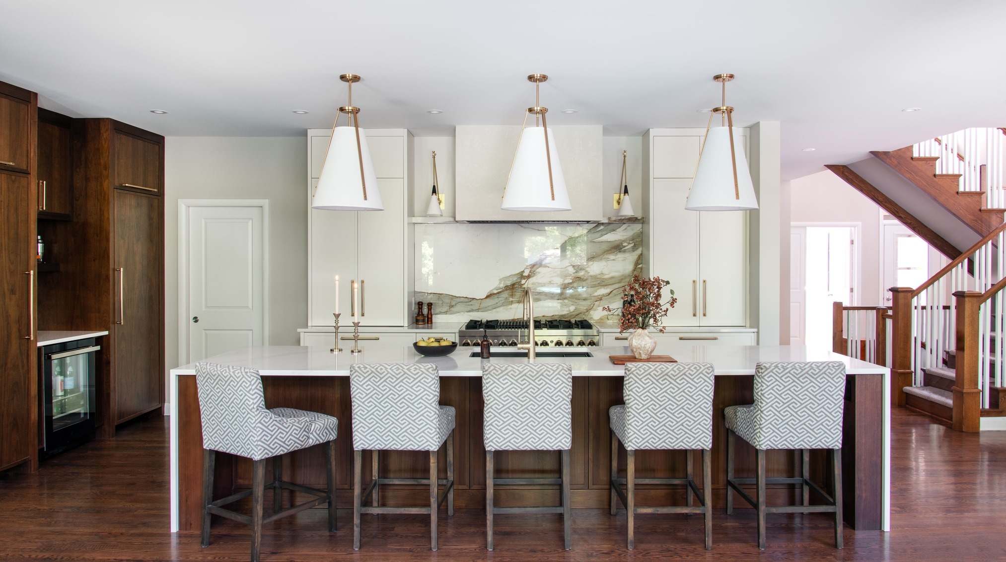 A dramatic, "wow" factor backsplash serves as the focal point, while custom wine storage offers both practicality and visual interest. Contemporary touches include a designated area for casual dining or work, brought to life by striking lighting fixtures that elevate the overall ambiance.