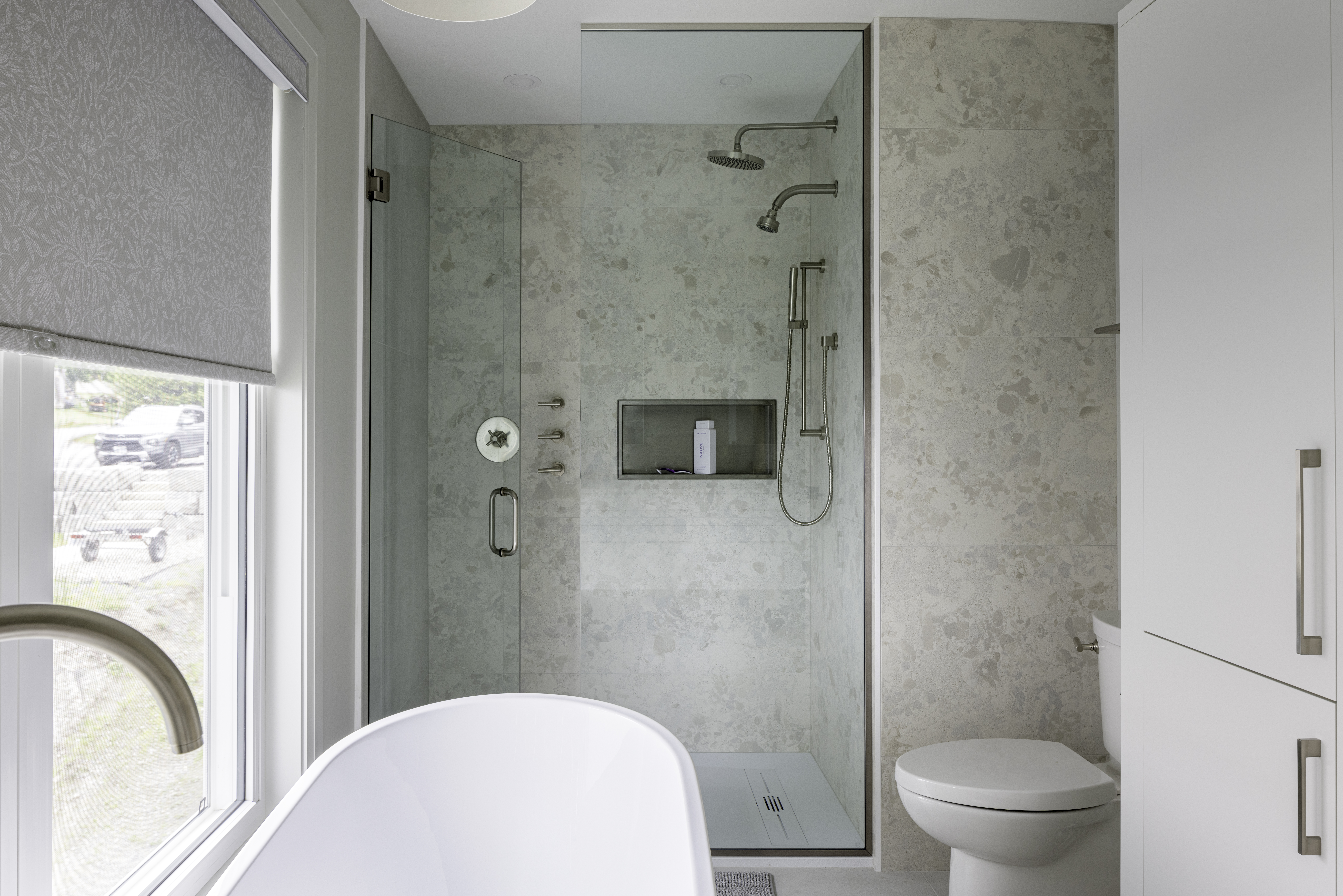 Every aspect of this bathroom has been thoughtfully crafted to balance luxury and simplicity. Attention to detail and the deliberate use of accessories heighten the space's allure while ensuring it remains functional and welcoming.