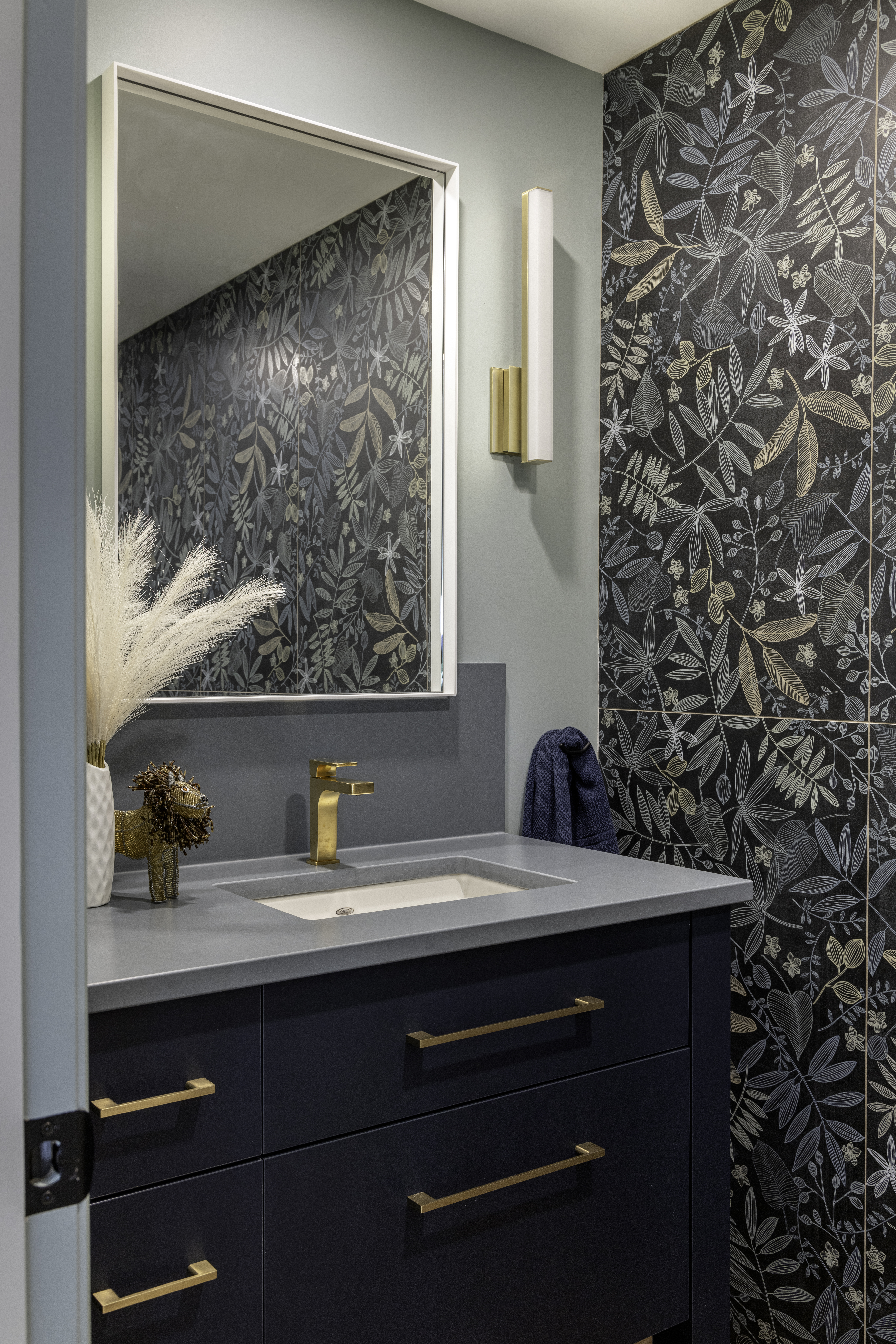 The design is anchored by its clean lines and meticulous attention to detail. Each accessory has been thoughtfully selected to enhance the bathroom's cohesive aesthetic. Soft tones harmonize to accentuate the sleek, bold tile in the shower, creating a striking yet balanced focal point that draws the eye.