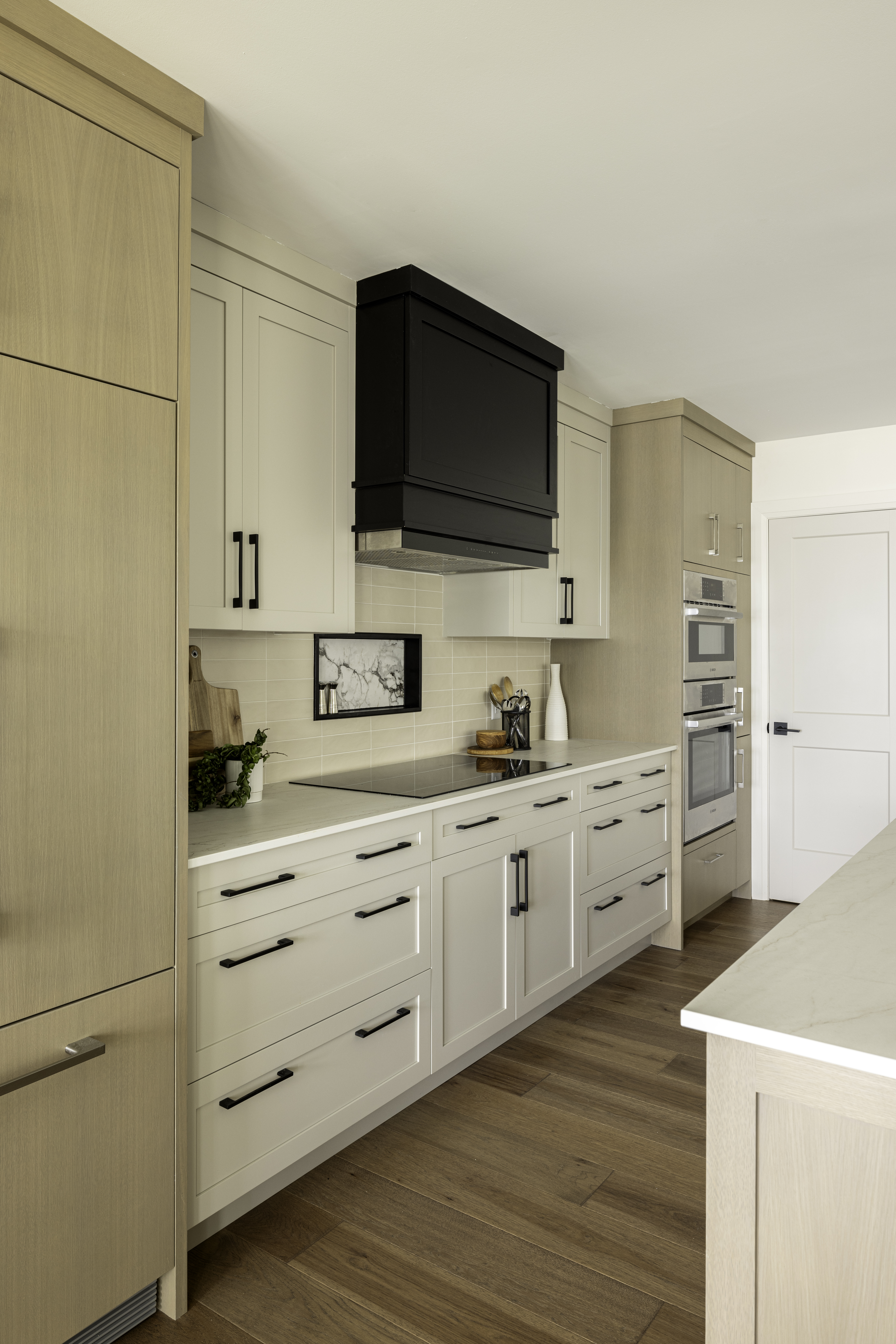 One of the key elements of this kitchen is the use of different materials and textures. The cabinetry combines painted finishes with natural wood, creating a beautiful contrast that adds visual interest. The upper cabinets are finished in a warm beige, while the base cabinets are ivory . The island, is done in a stained white Oak, serves as a focal point and ties the whole design together.