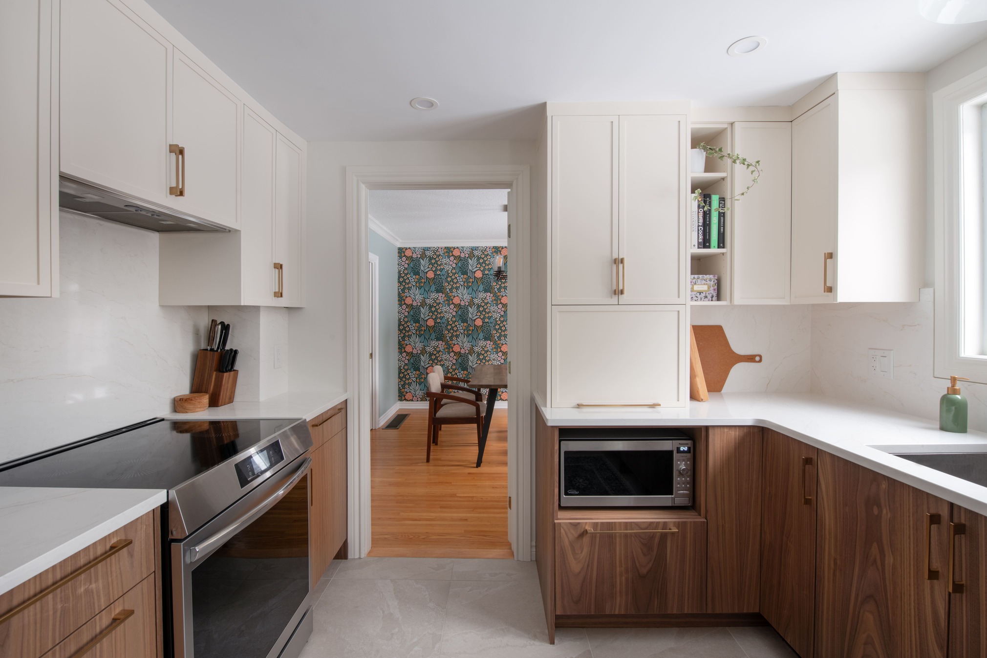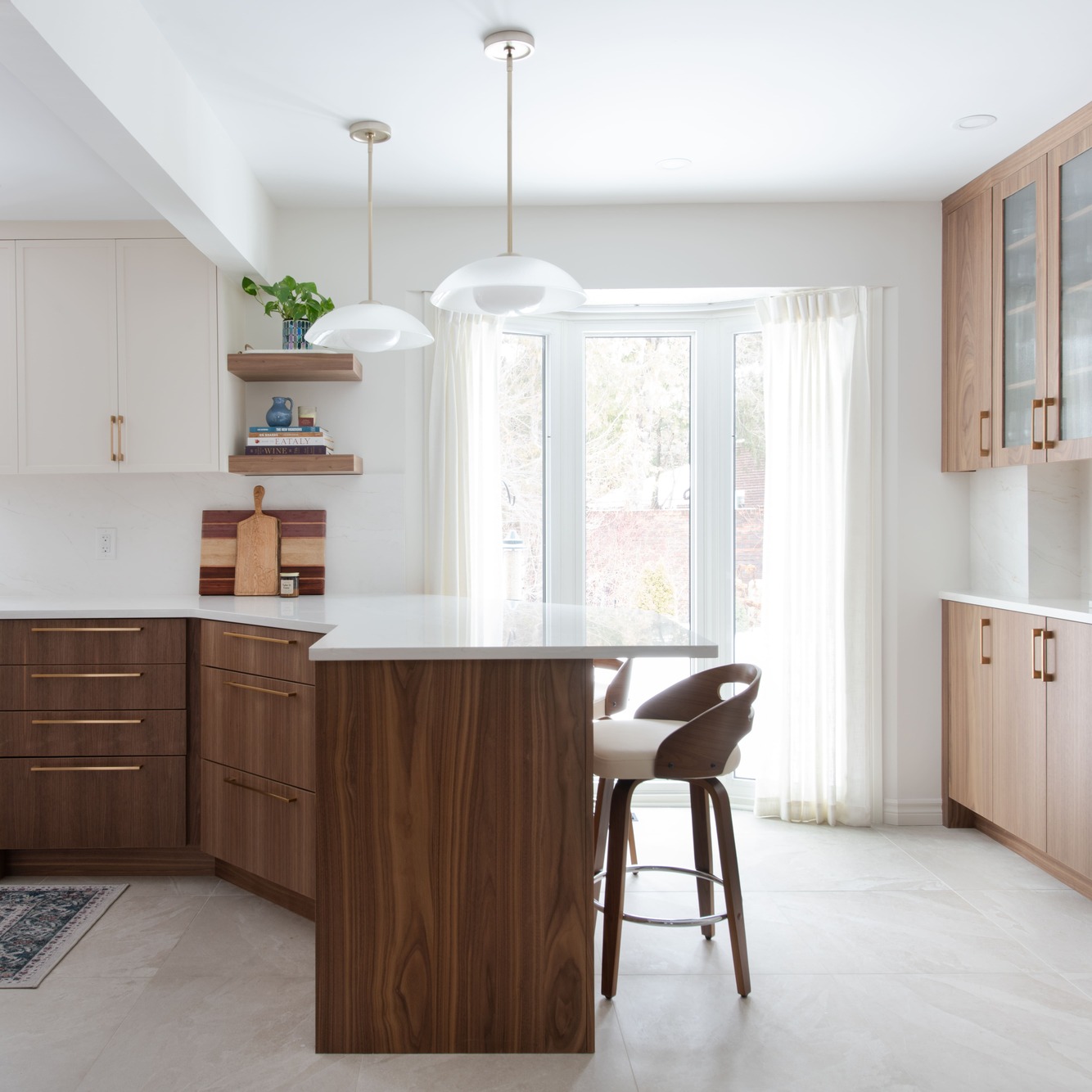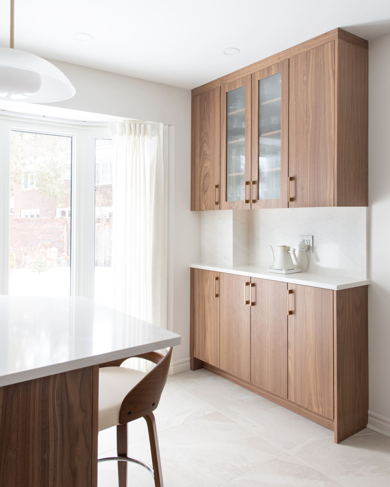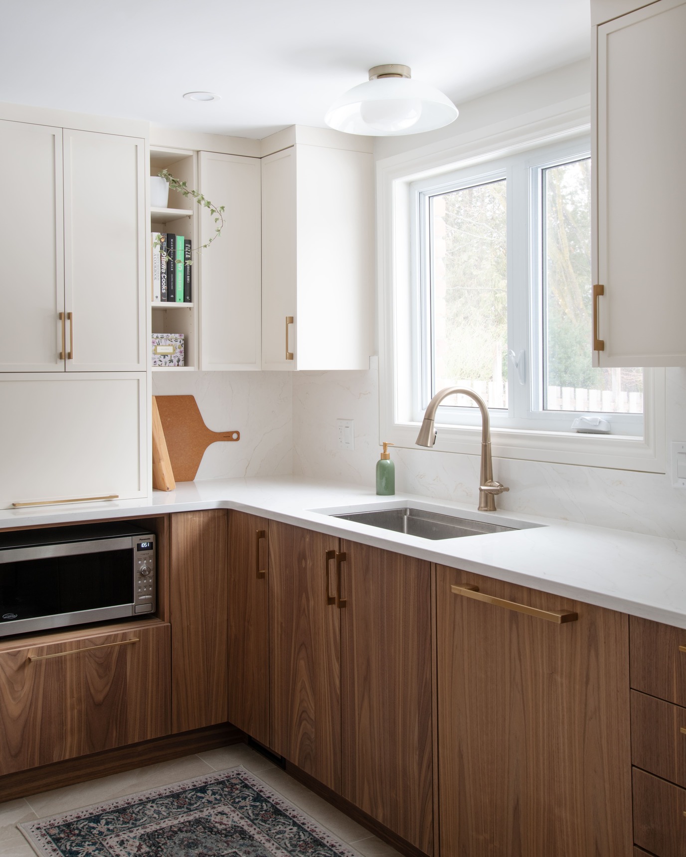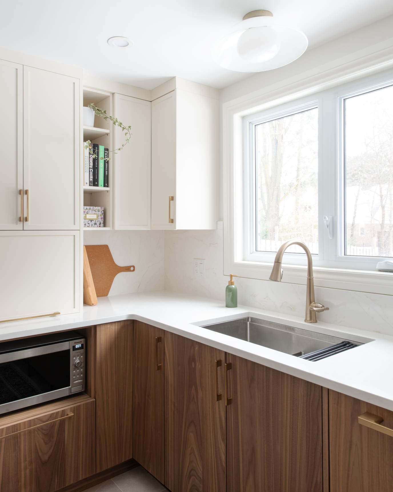 This kitchen design blends warmth and softness through a thoughtful mix of natural walnut and painted cabinetry. Rich walnut lower cabinets ground the space with organic texture and depth, while slim Shaker-style upper cabinets in a soft Linen finish introduce a light, tailored contrast.