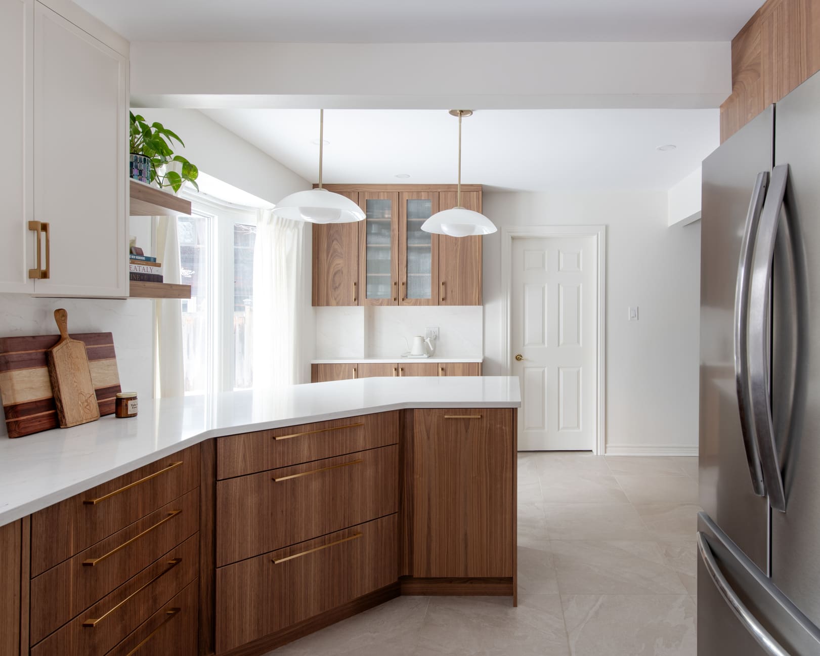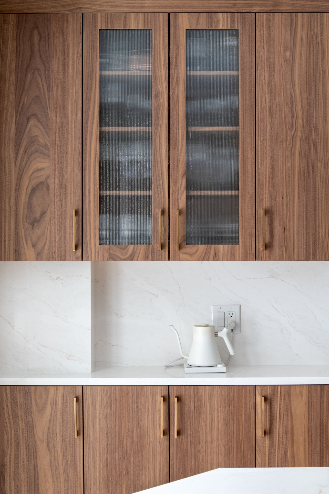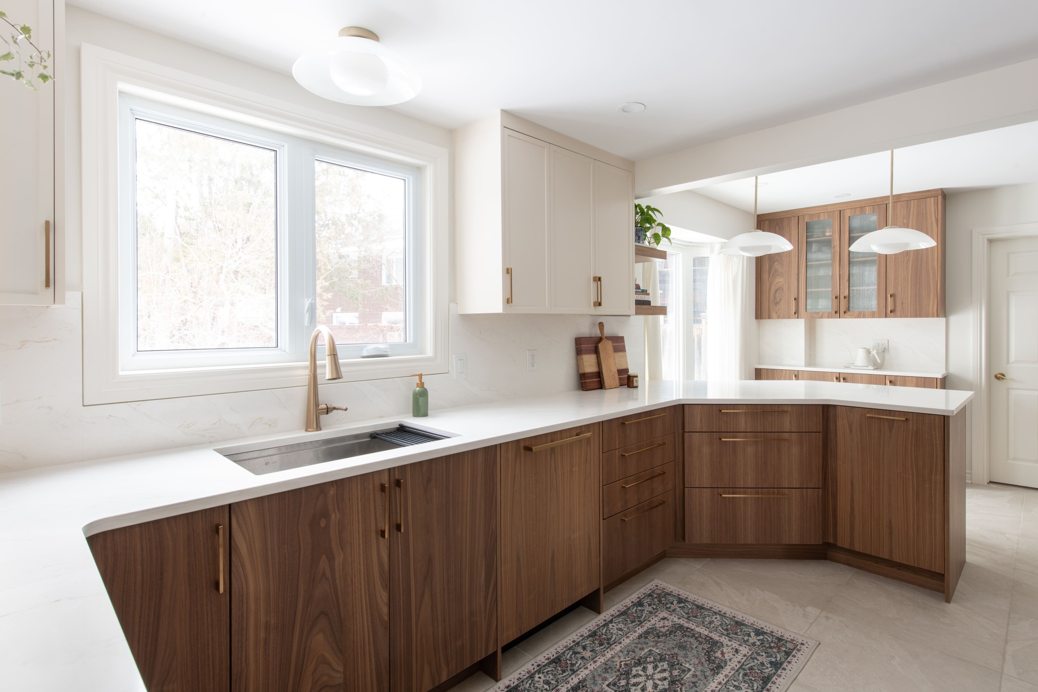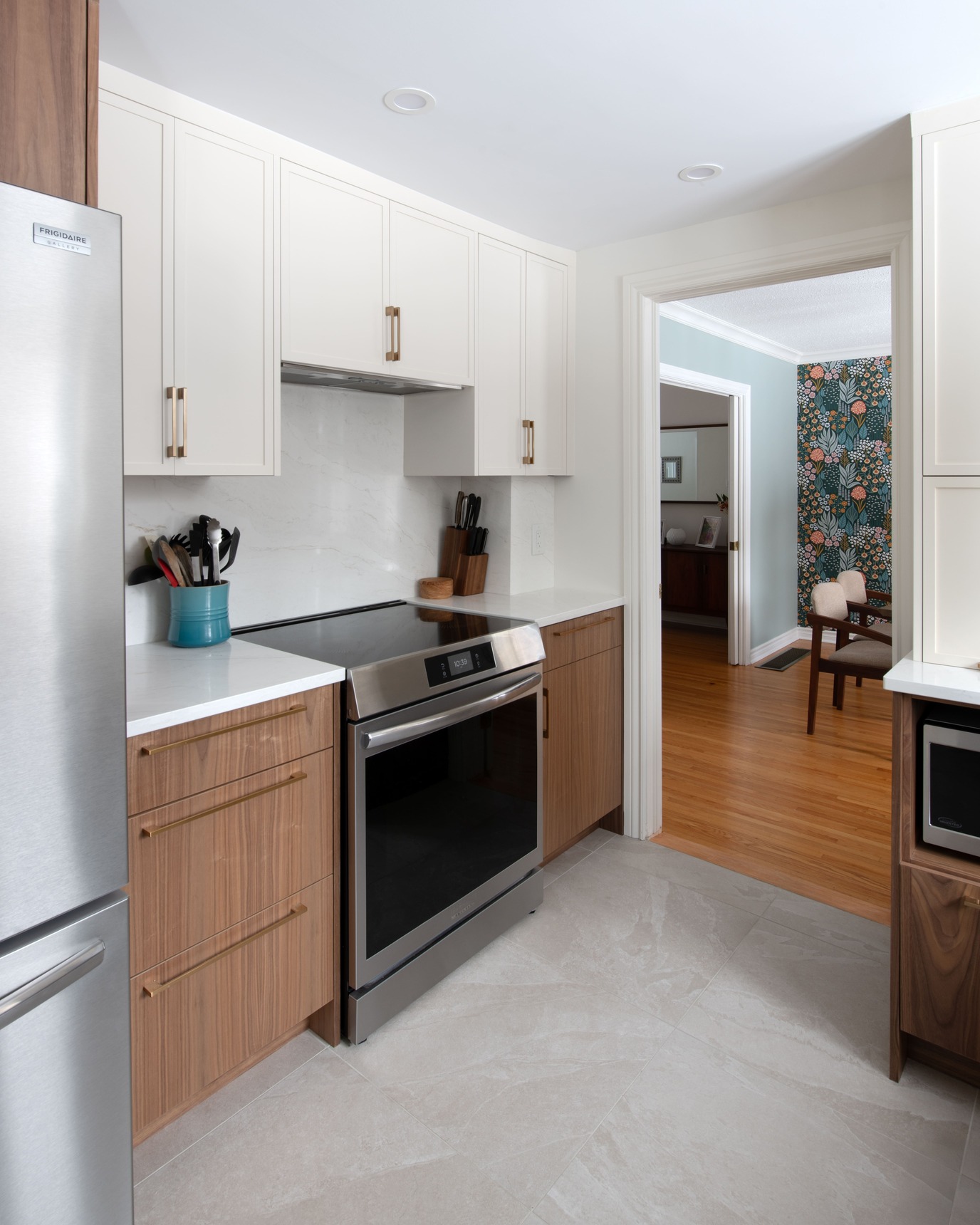 This kitchen design blends warmth and softness through a thoughtful mix of natural walnut and painted cabinetry. Rich walnut lower cabinets ground the space with organic texture and depth, while slim Shaker-style upper cabinets in a soft Linen finish introduce a light, tailored contrast.