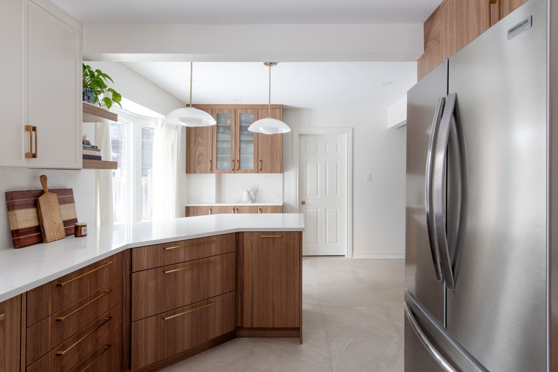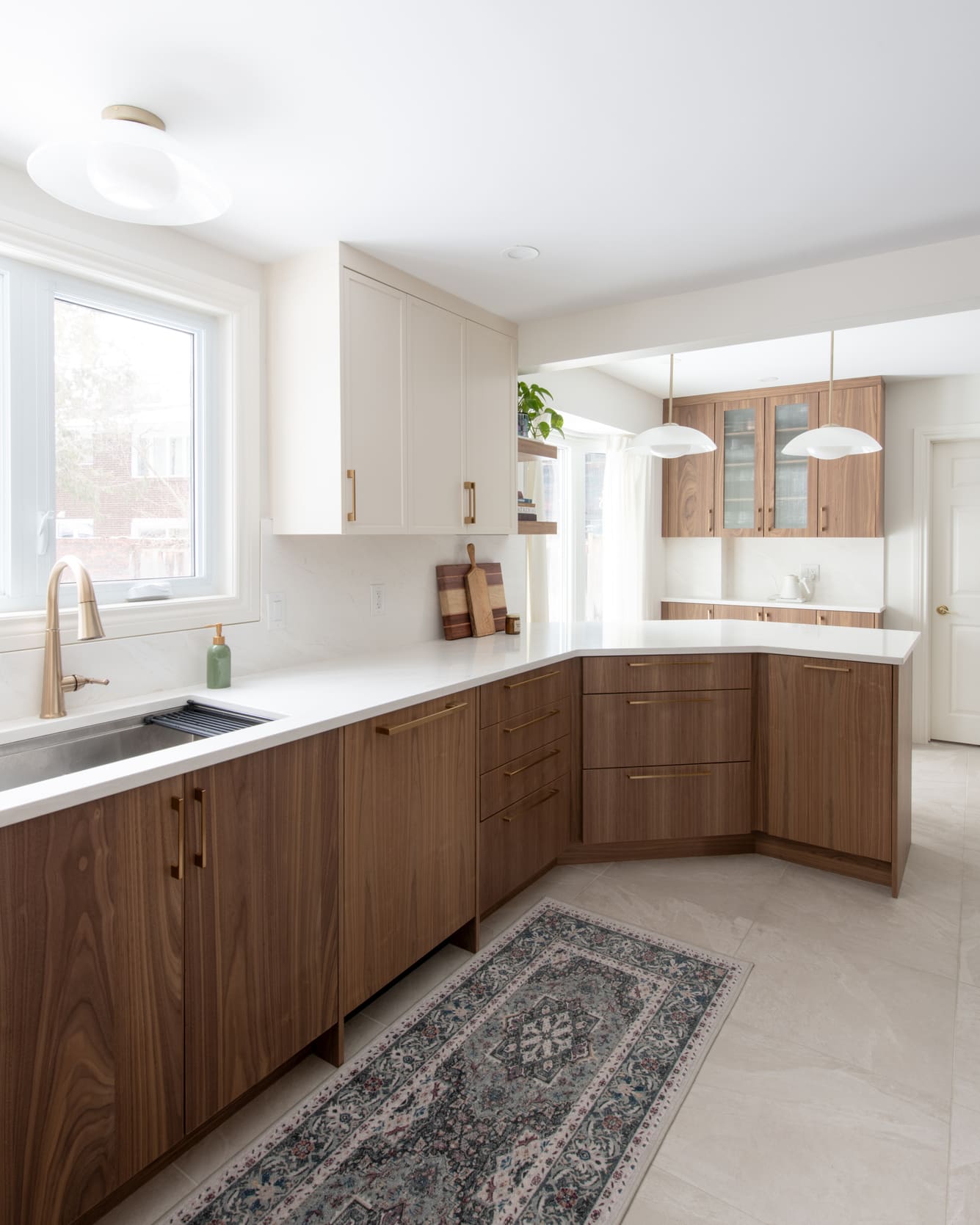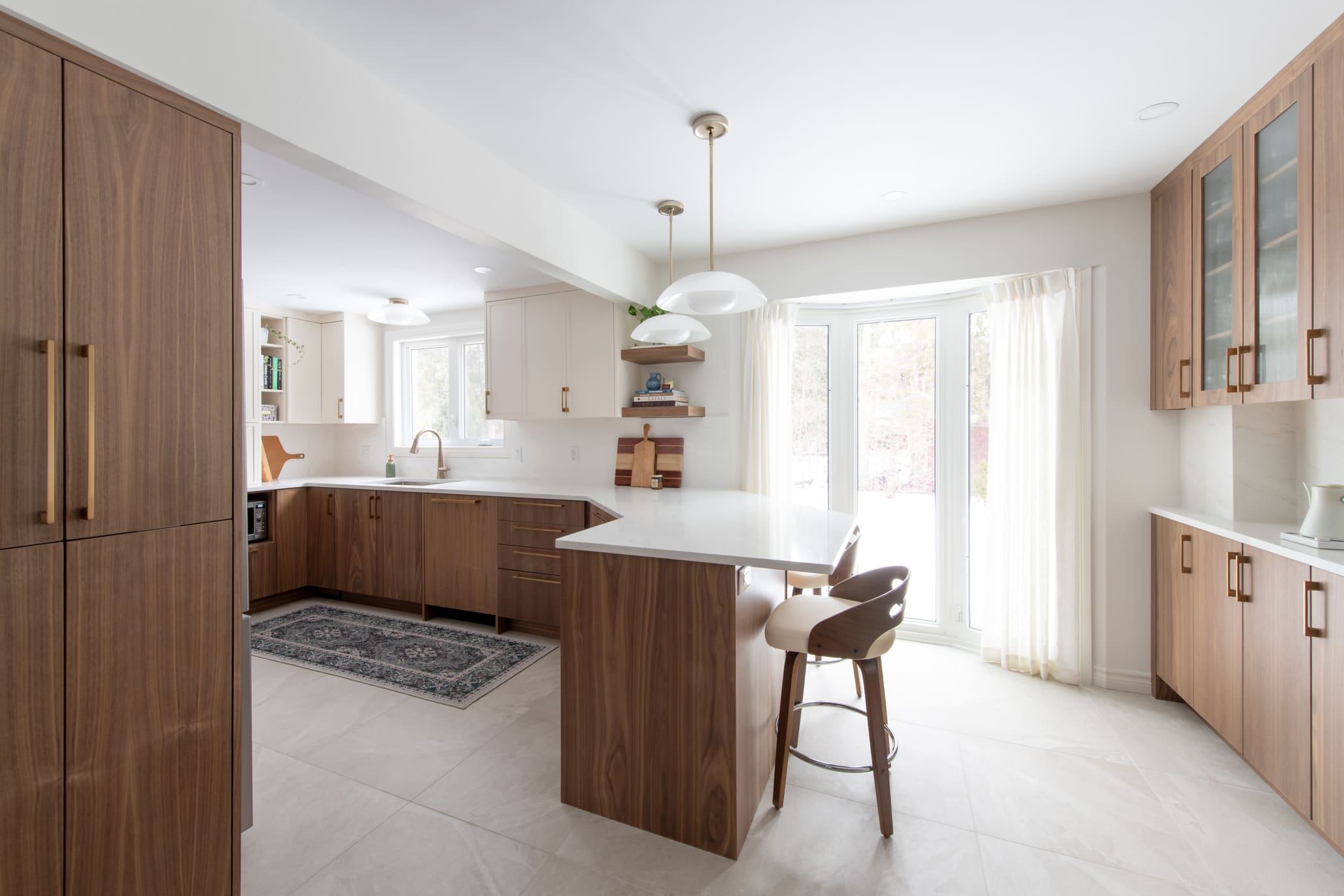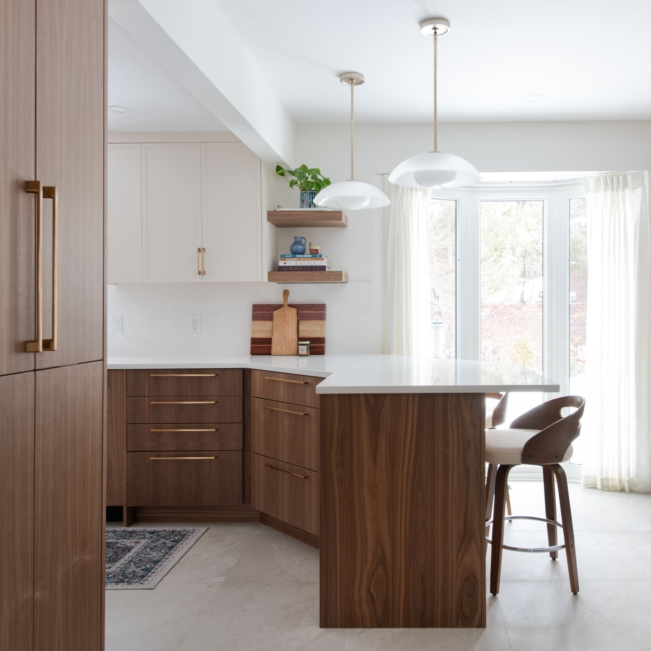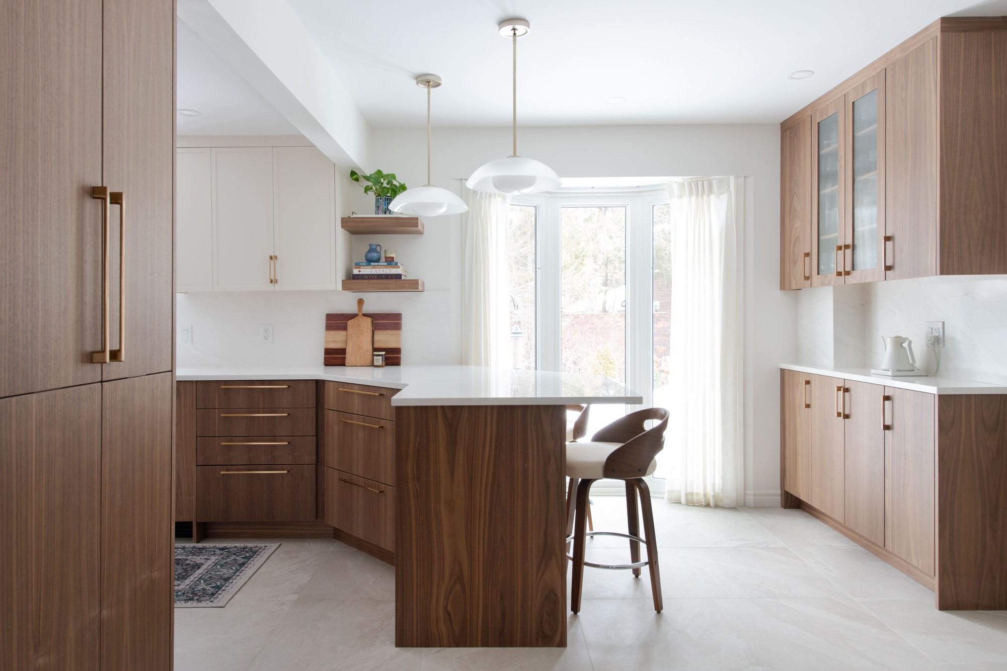 This kitchen design blends warmth and softness through a thoughtful mix of natural walnut and painted cabinetry. Rich walnut lower cabinets ground the space with organic texture and depth, while slim Shaker-style upper cabinets in a soft Linen finish introduce a light, tailored contrast.
