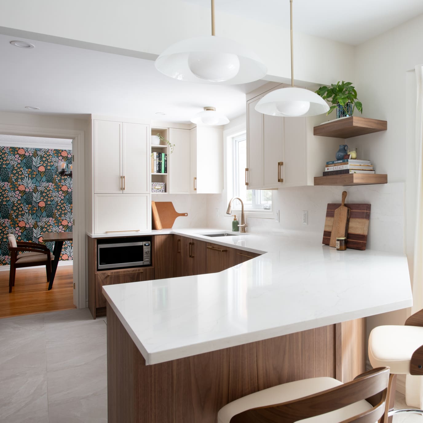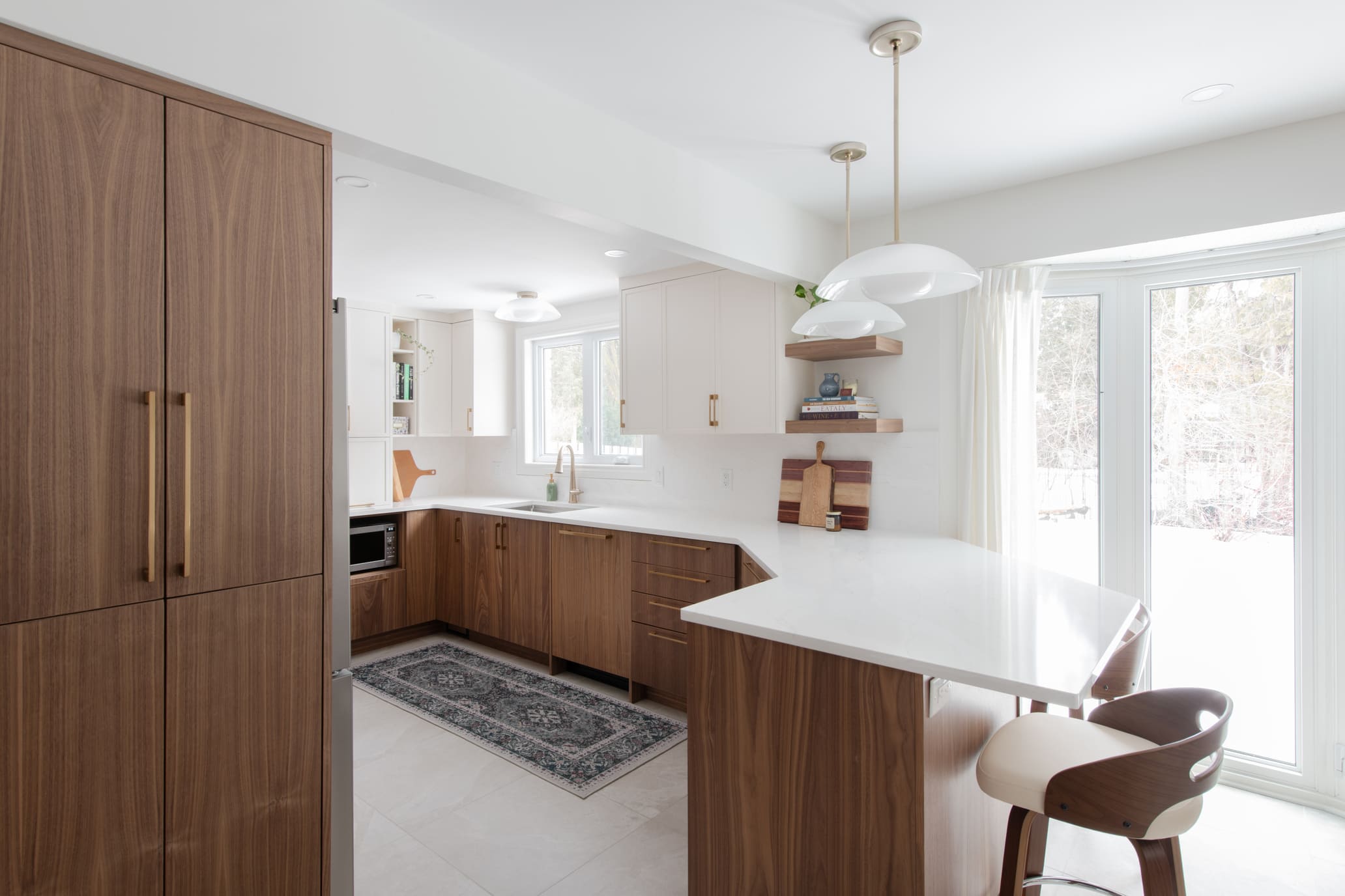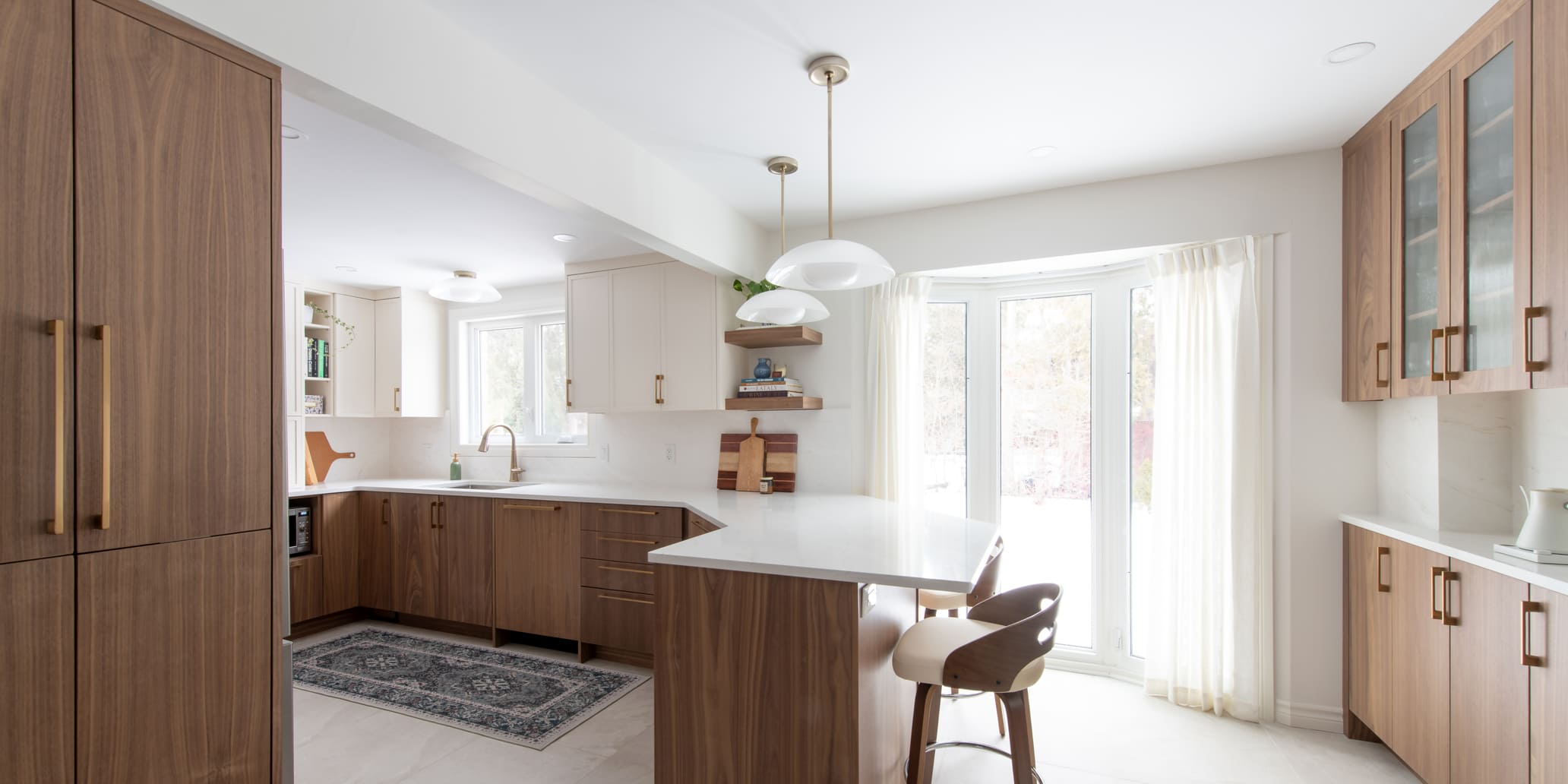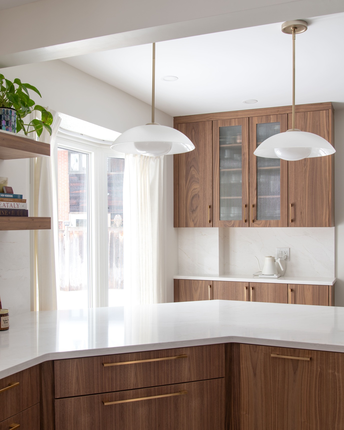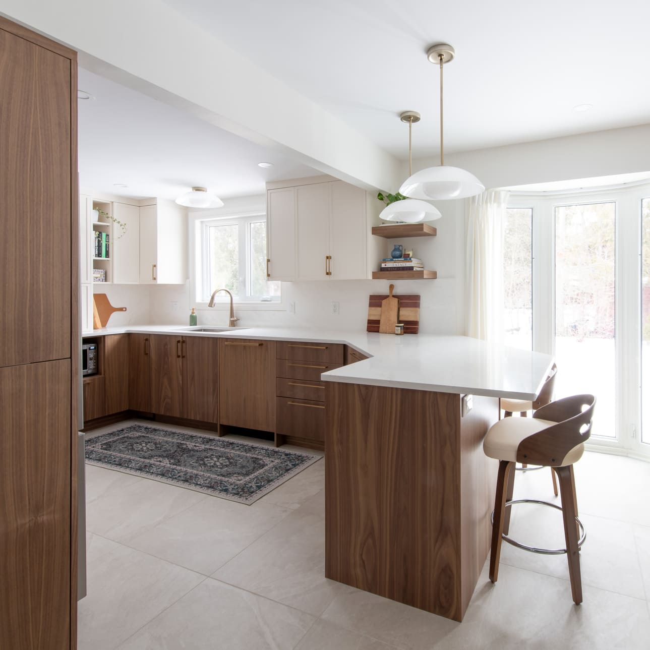 This kitchen design blends warmth and softness through a thoughtful mix of natural walnut and painted cabinetry. Rich walnut lower cabinets ground the space with organic texture and depth, while slim Shaker-style upper cabinets in a soft Linen finish introduce a light, tailored contrast.