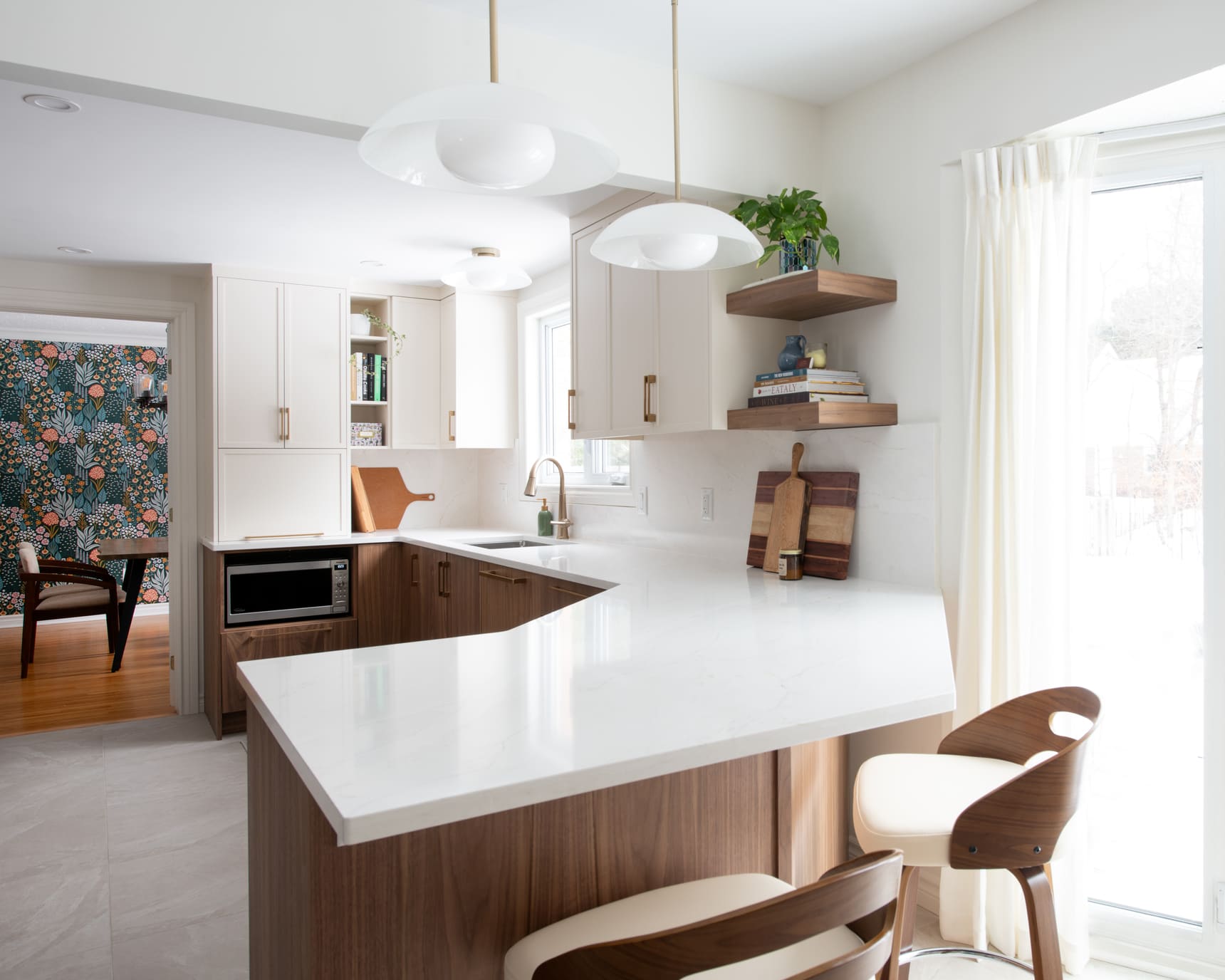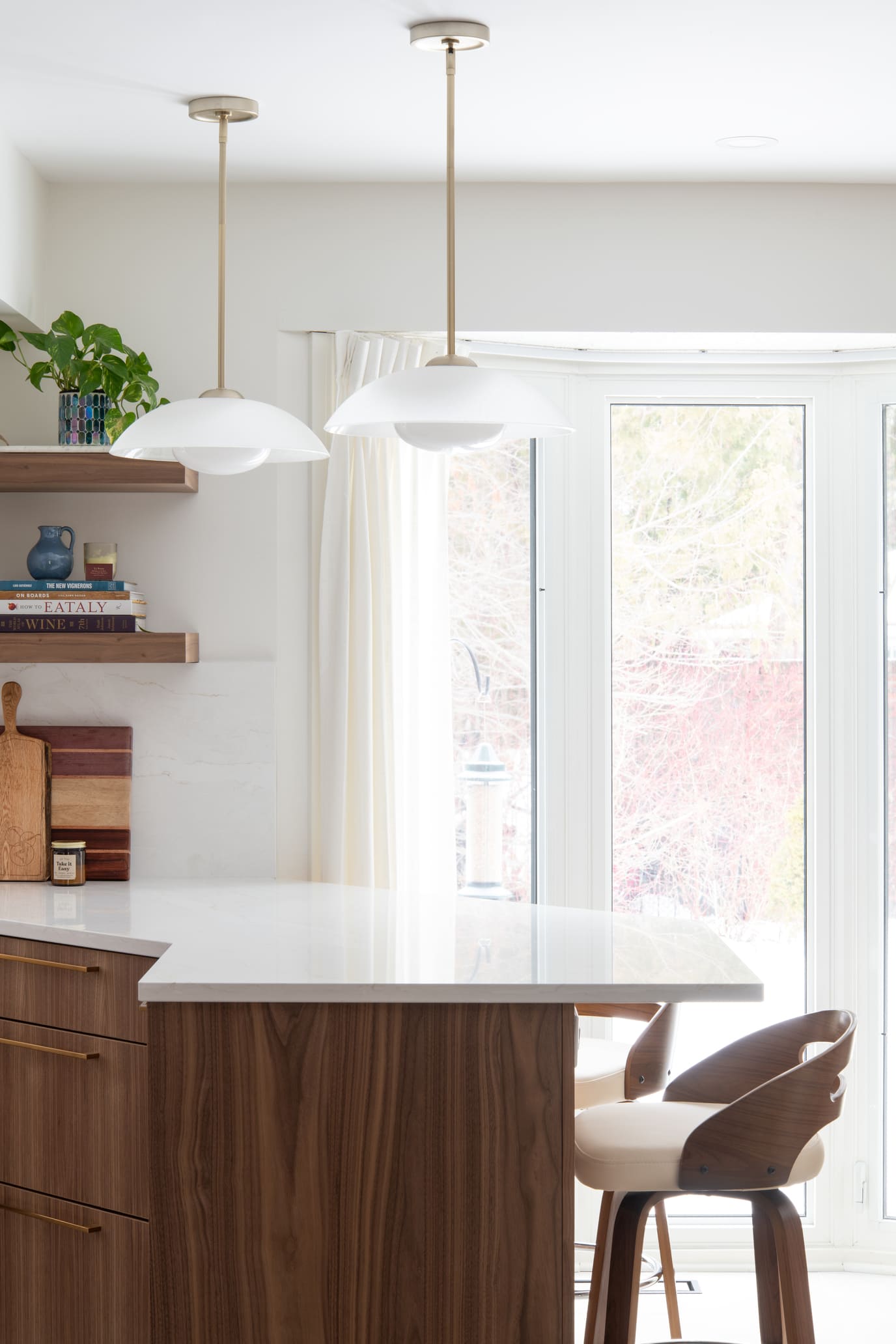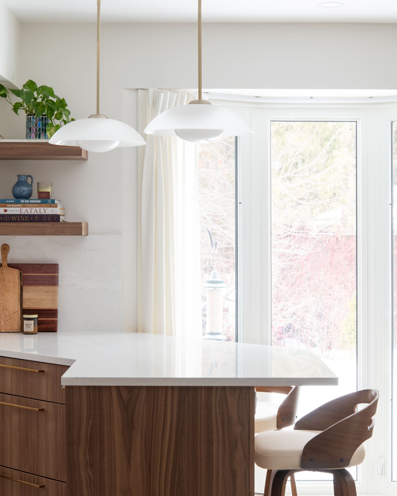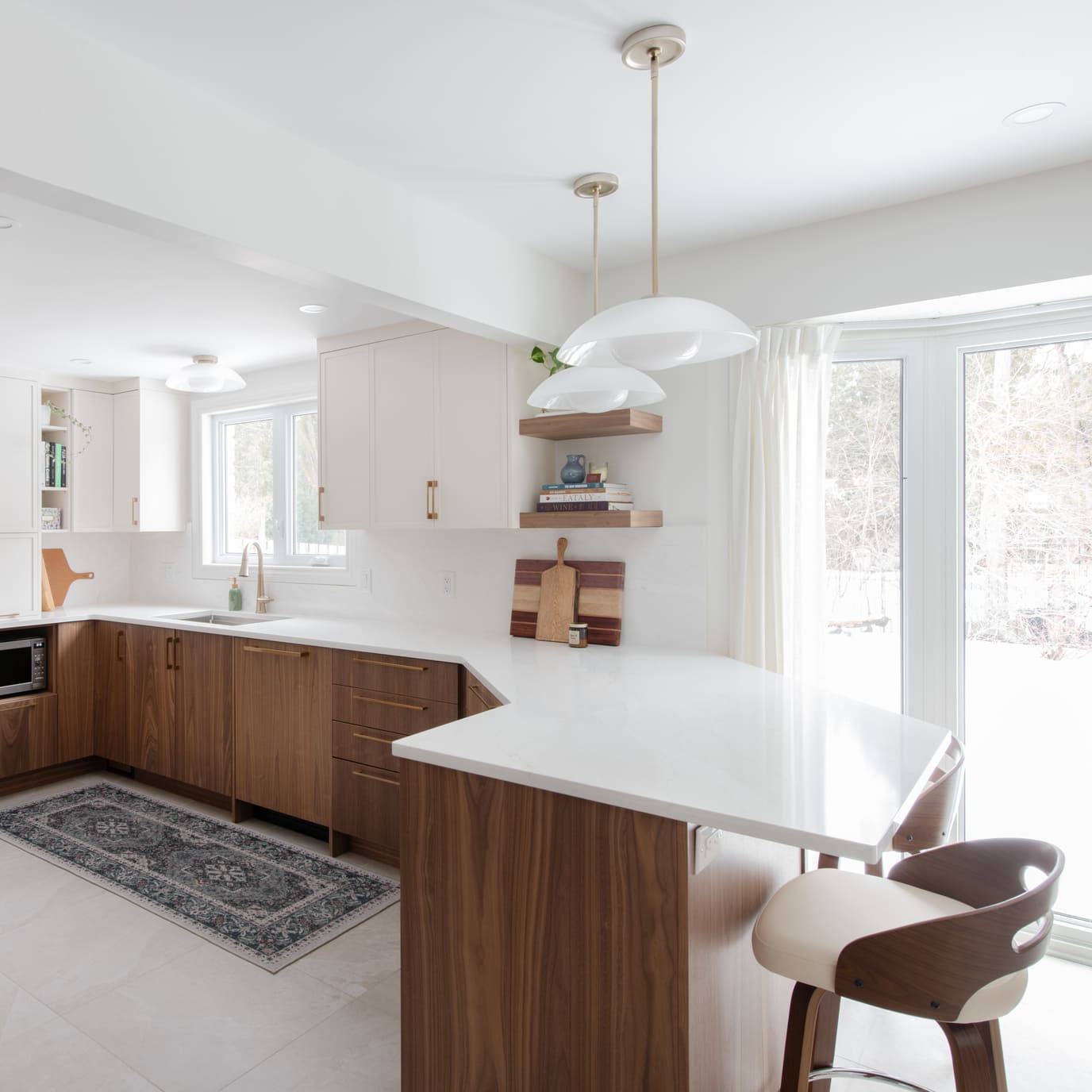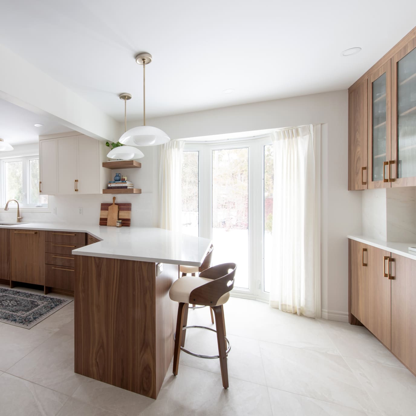 A bright white quartz countertop and full-height backsplash reflect natural light from the surrounding windows, enhancing the kitchen’s airy feel. The angled peninsula adds both visual interest and everyday functionality, creating a welcoming transition between prep space and seating — ideal for casual meals, homework sessions, and gathering with family.