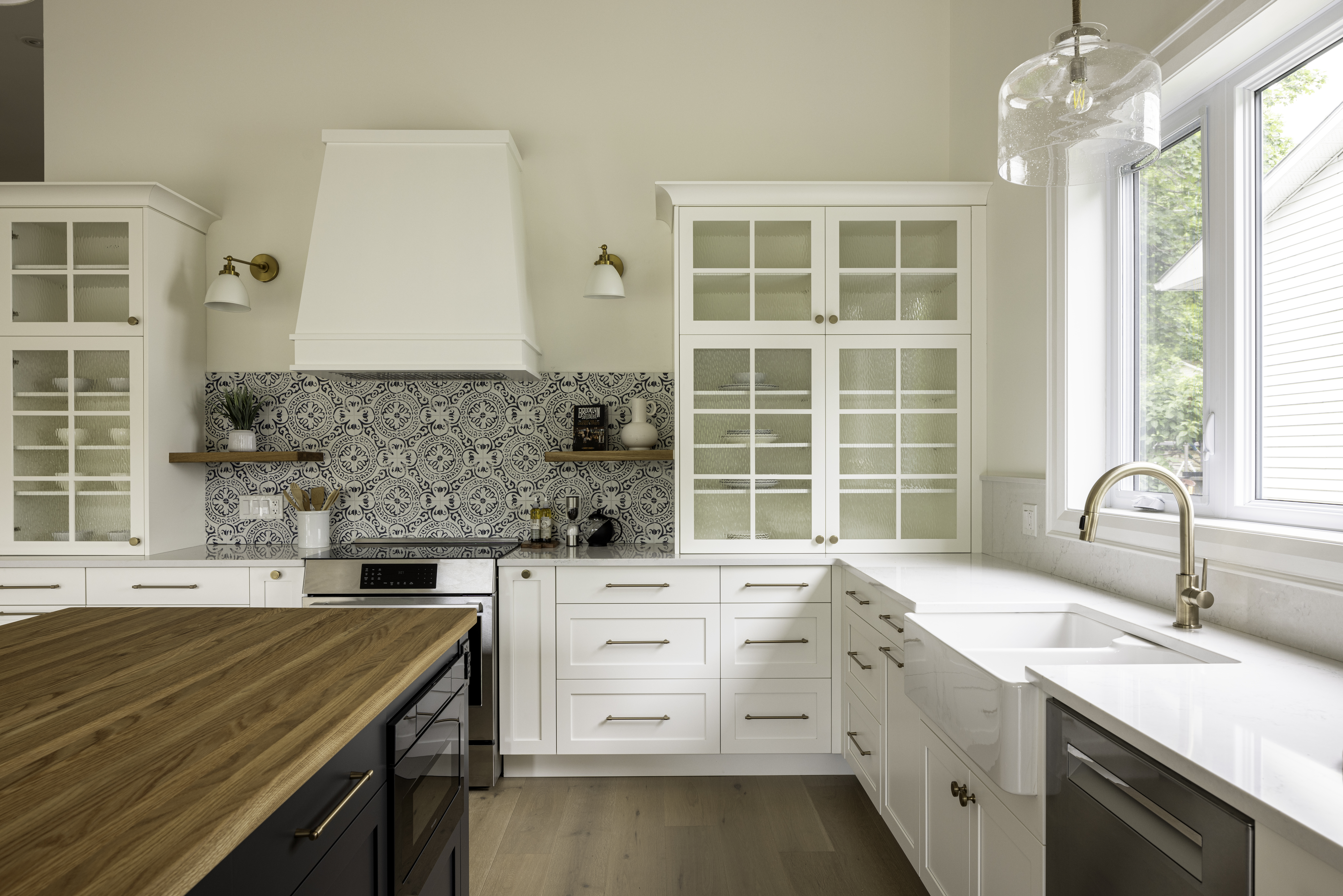 Originally, the kitchen had two windows with the range centered between them. To enhance functionality and design, this layout was revised. A single large window was placed over the sink, allowing natural light to flood the workspace, while the range was relocated to another wall, making it a striking focal point.
