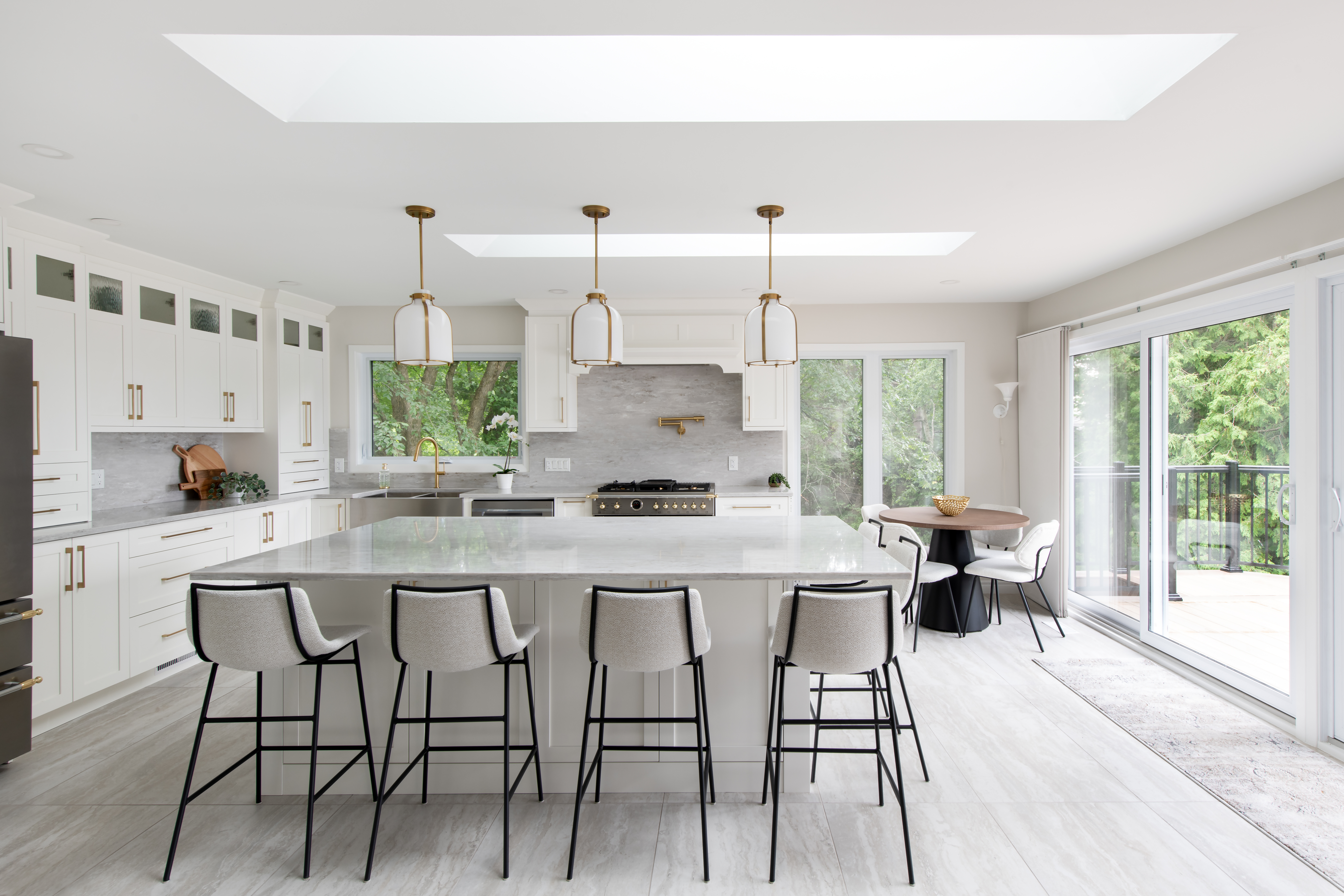 A major highlight of the renovation is the centered island, perfectly aligned under two large skylights. This strategic placement floods the kitchen with natural light, creating an airy and open feel. The island offers ample seating, making it ideal for hosting large gatherings and ensuring the space is both functional and welcoming.