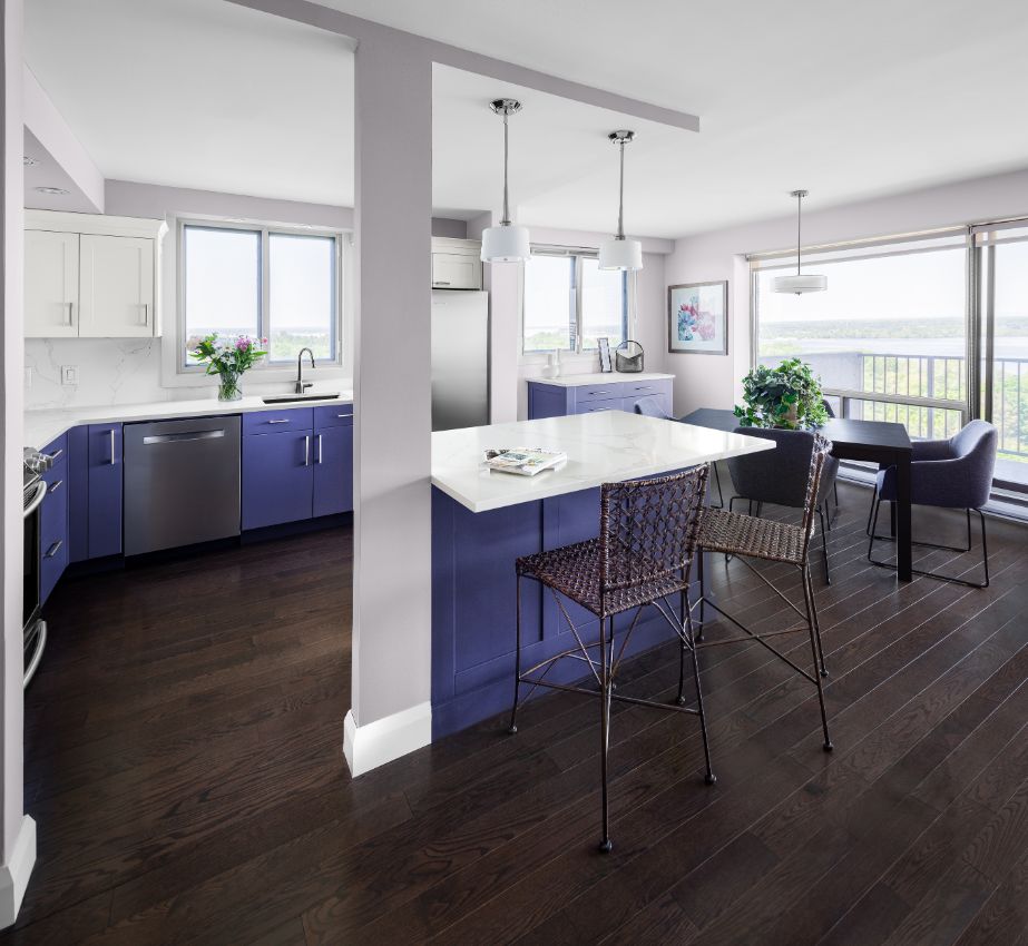 The cabinets feature Deslaurier's "Brookfield" shaker-style door in MDF, painted in a one-of-a-kind purple custom colour match on the perimeter base and island cabinets and a timeless white for the slab door upper wall cabinets.