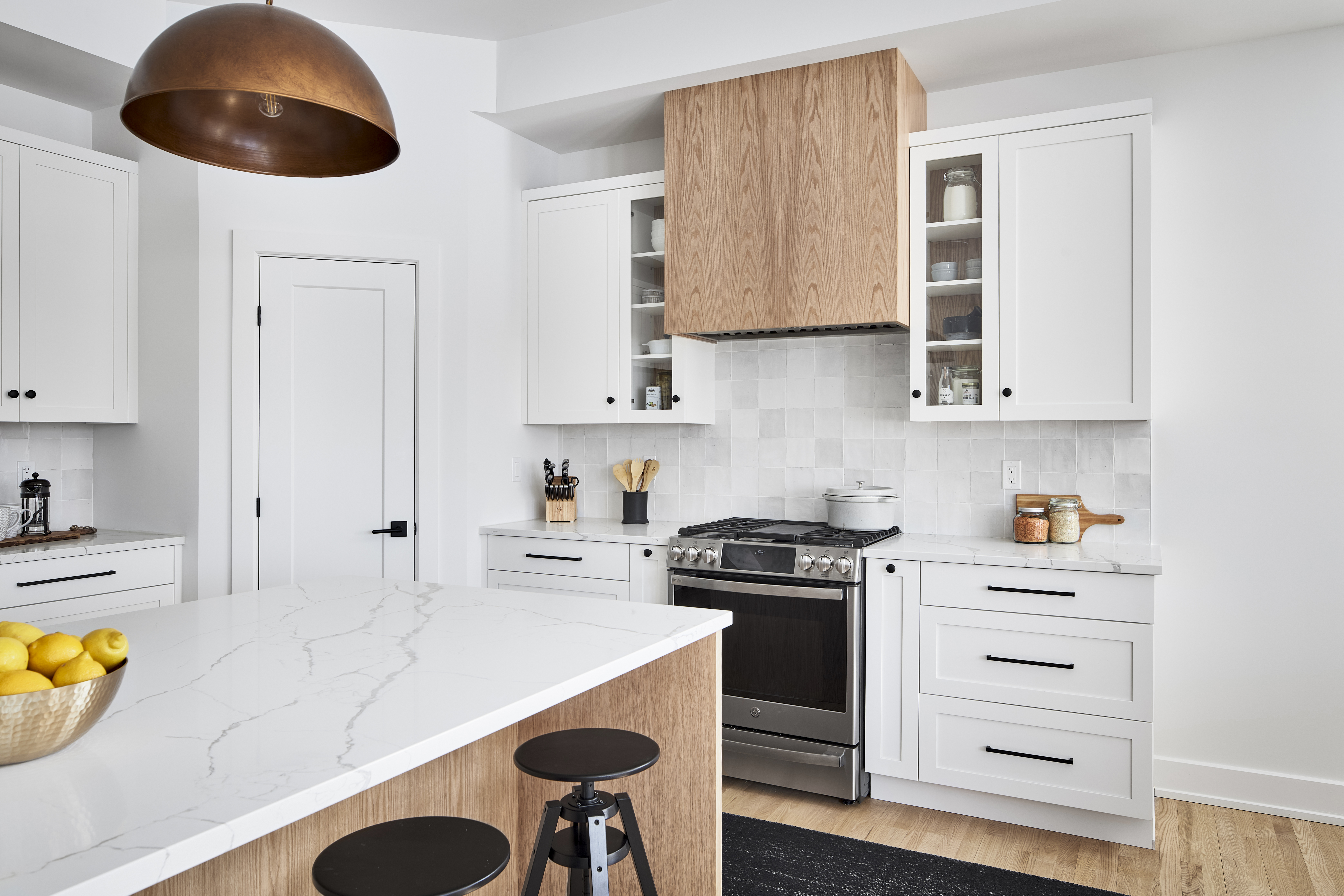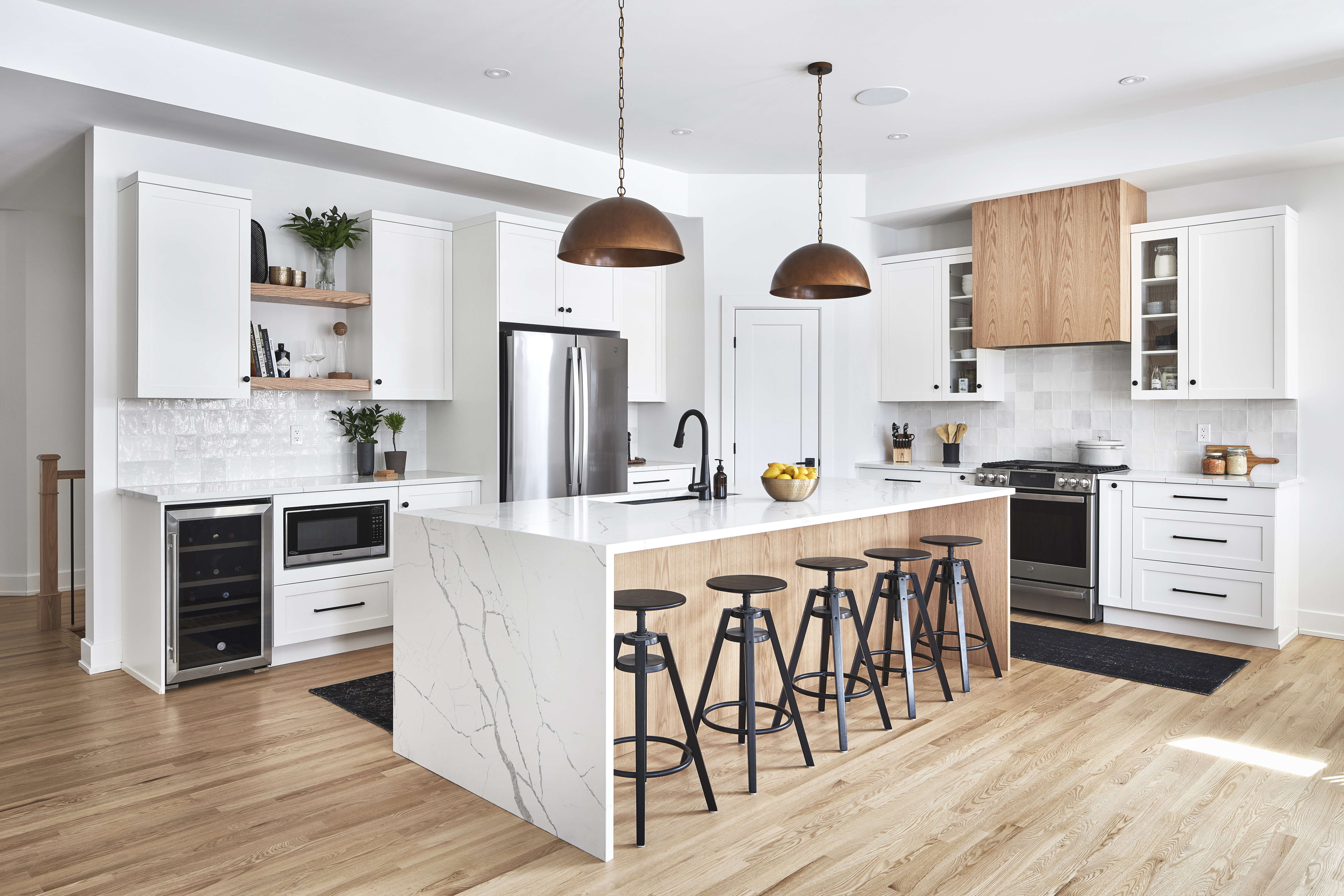 Our timeless "Brookfield" shaker style cabinets are painted Classic White, offering a fresh and lively juxtaposition with the natural oak grain of the custom decorative range hood, open shelving, and kitchen island. A dazzling quartz waterfall countertop lit by vintage brass pendant lights sweeps you off your feet, while Matte Black Berenson hardware subtly grounds the light colour scheme. Meanwhile, the undermount sink, built-in microwave, and glass cabinet doors all work in unison to incorporate ease and convenience into daily living.