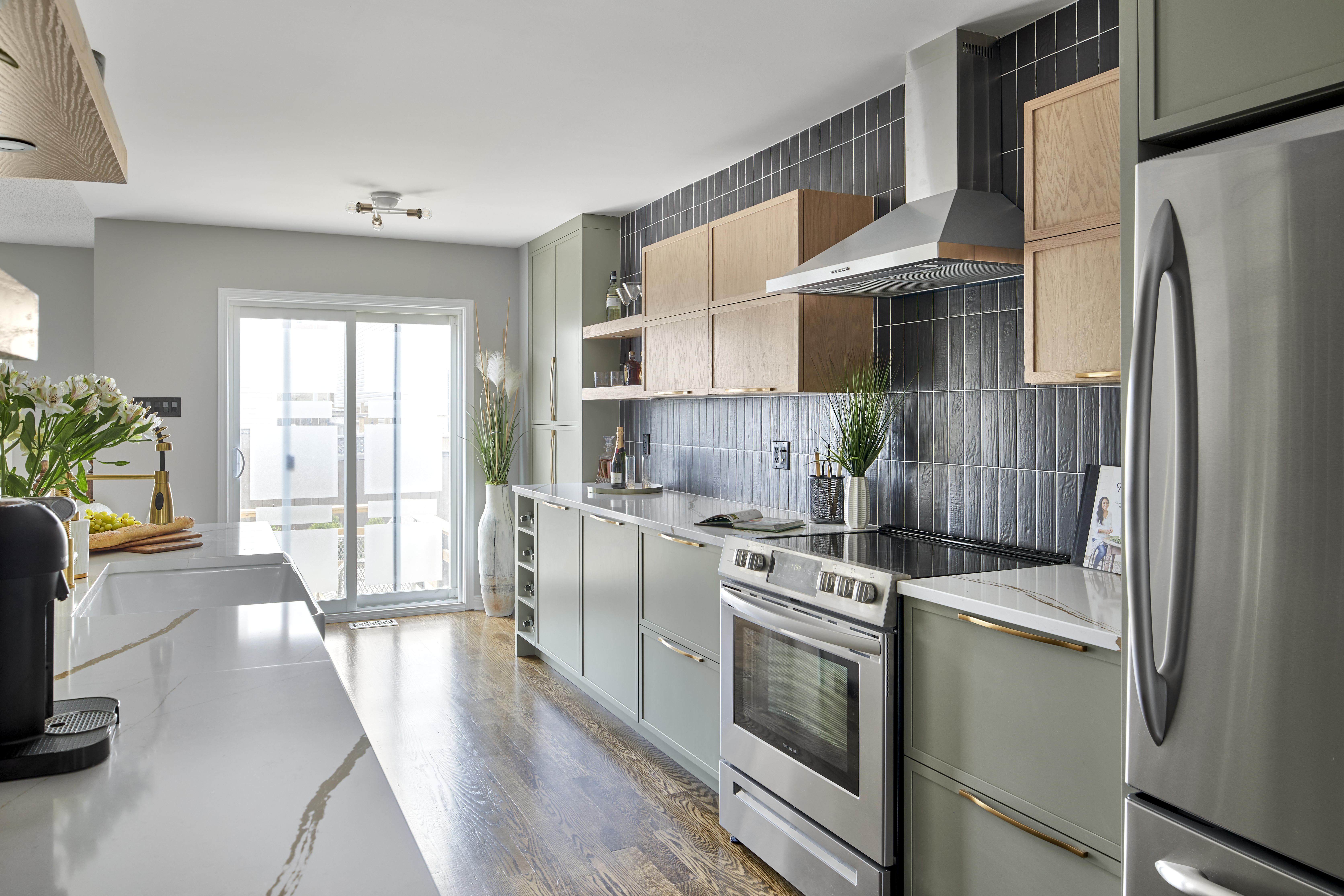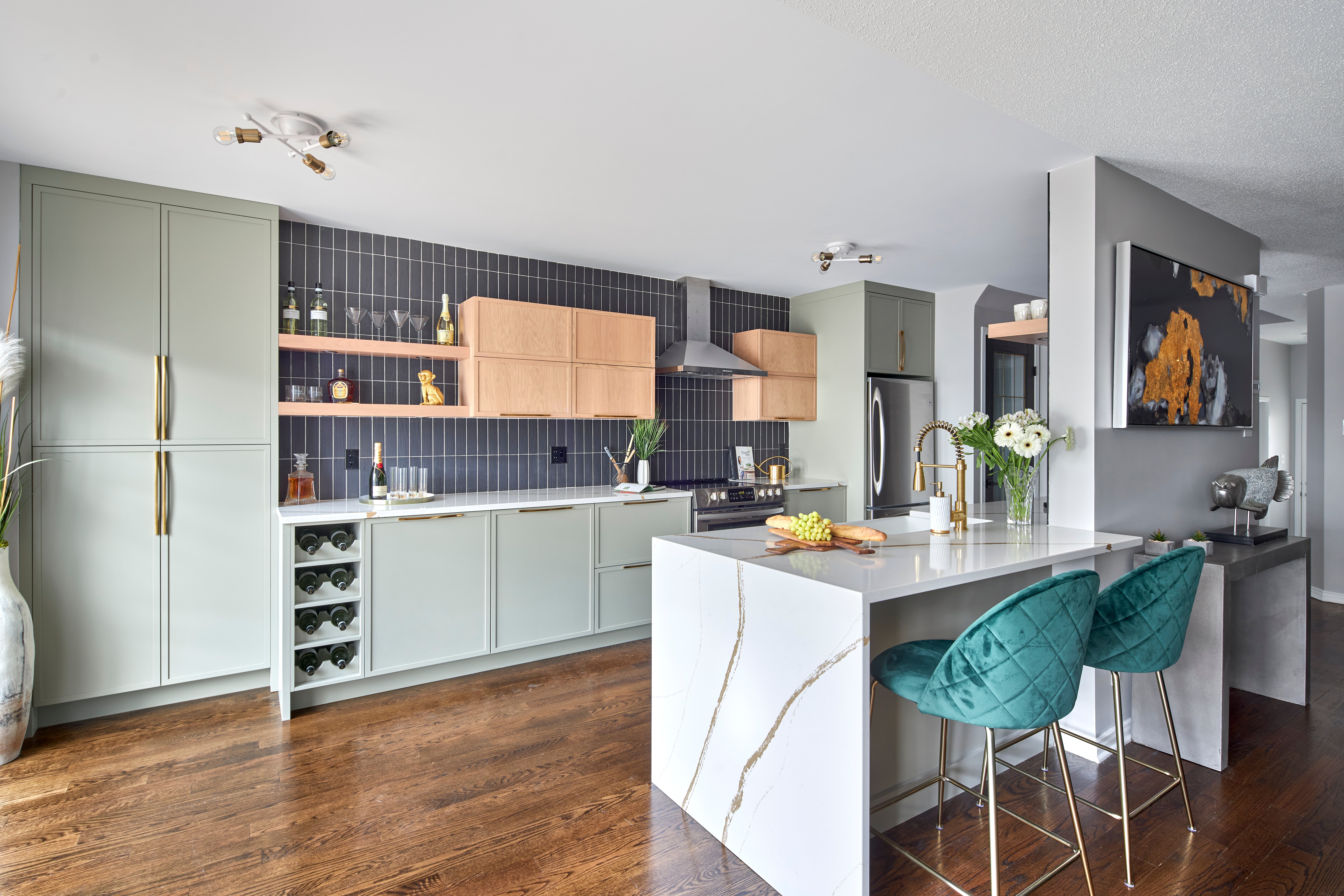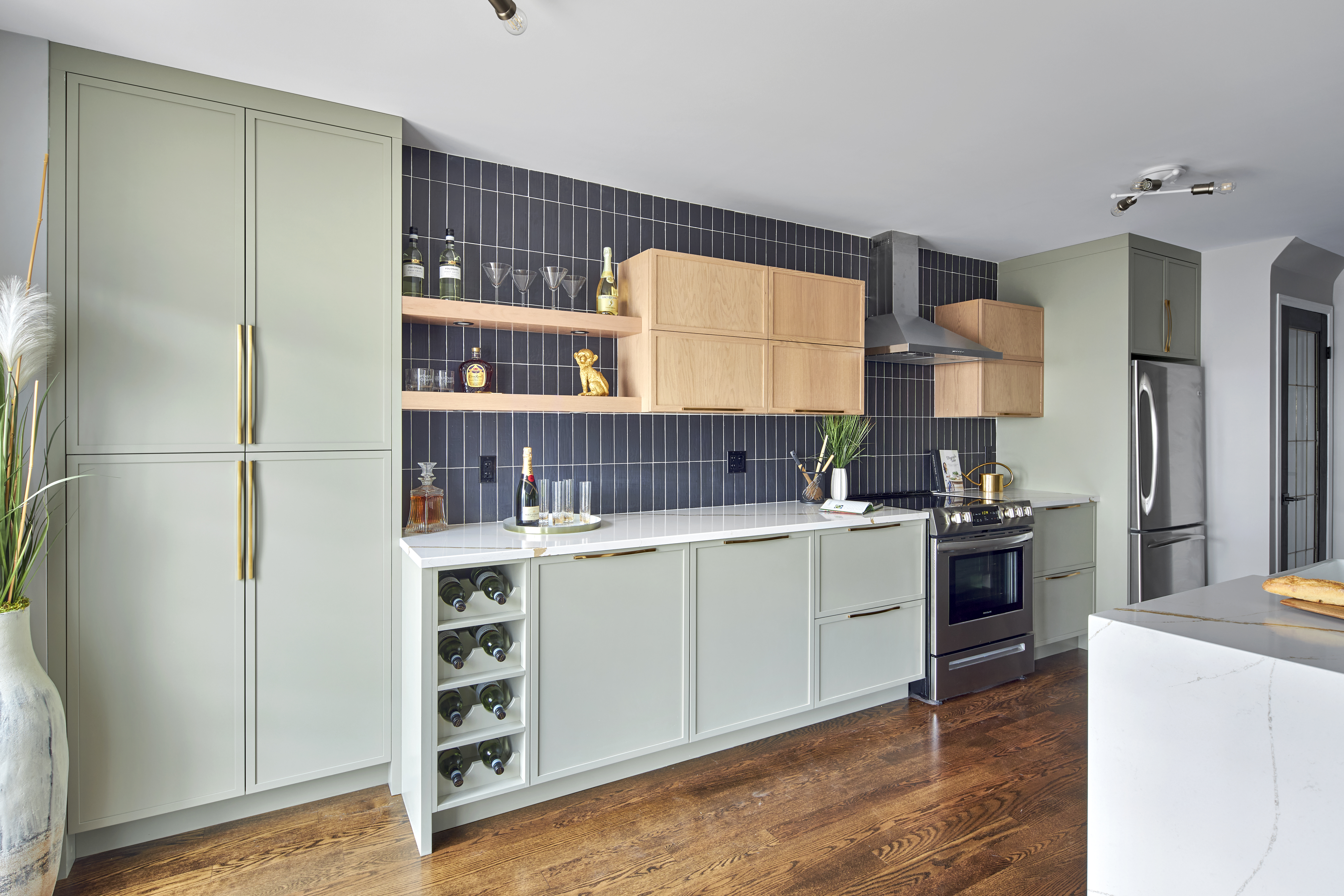 Deslaurier’s new thin shaker Litchfield door style is prominently on display, painted Sage Green in MDF for the base cabinets and stained in Oak for the uppers. Gold hardware by Richelieu adds a touch of glamour and glitz to the lot.