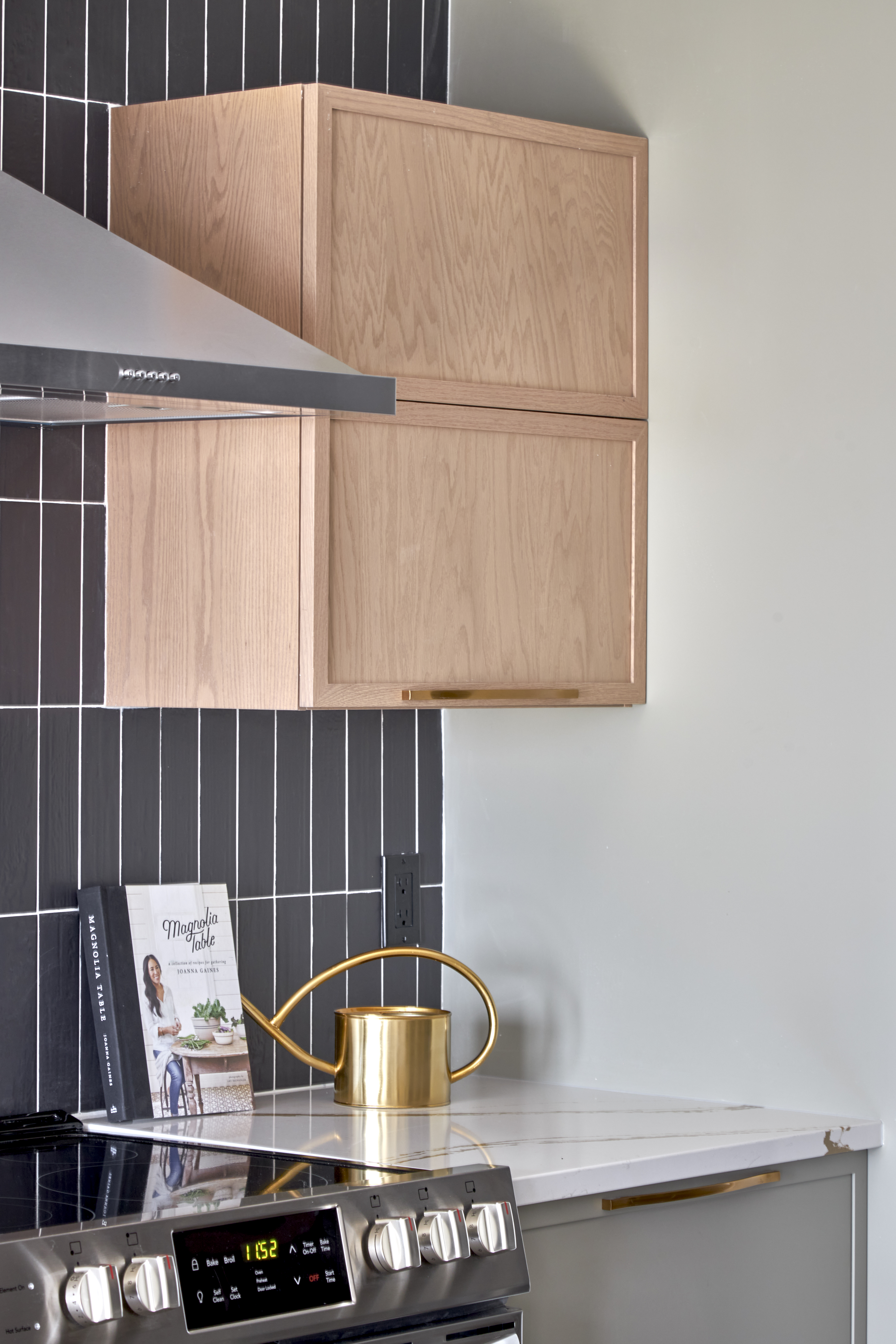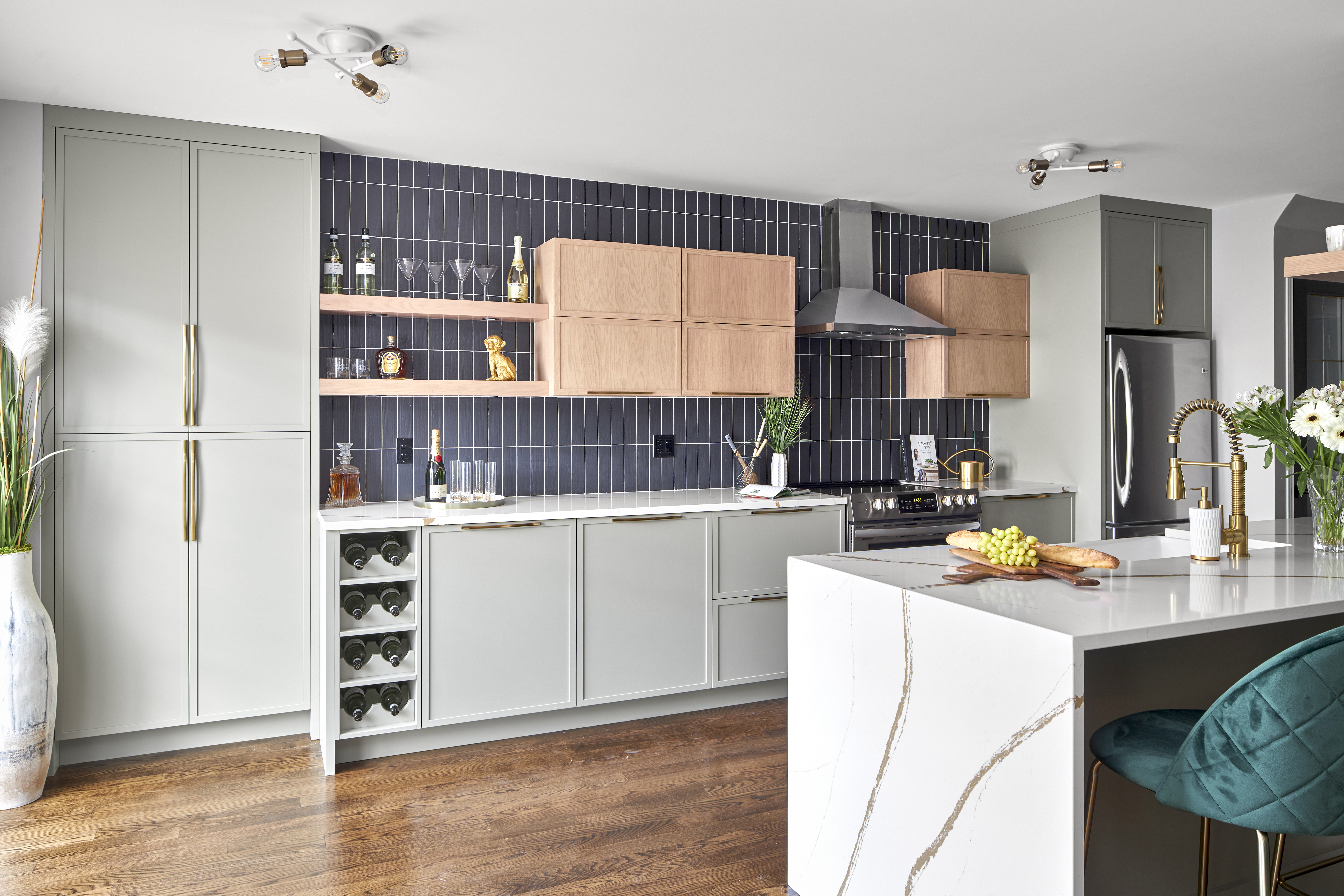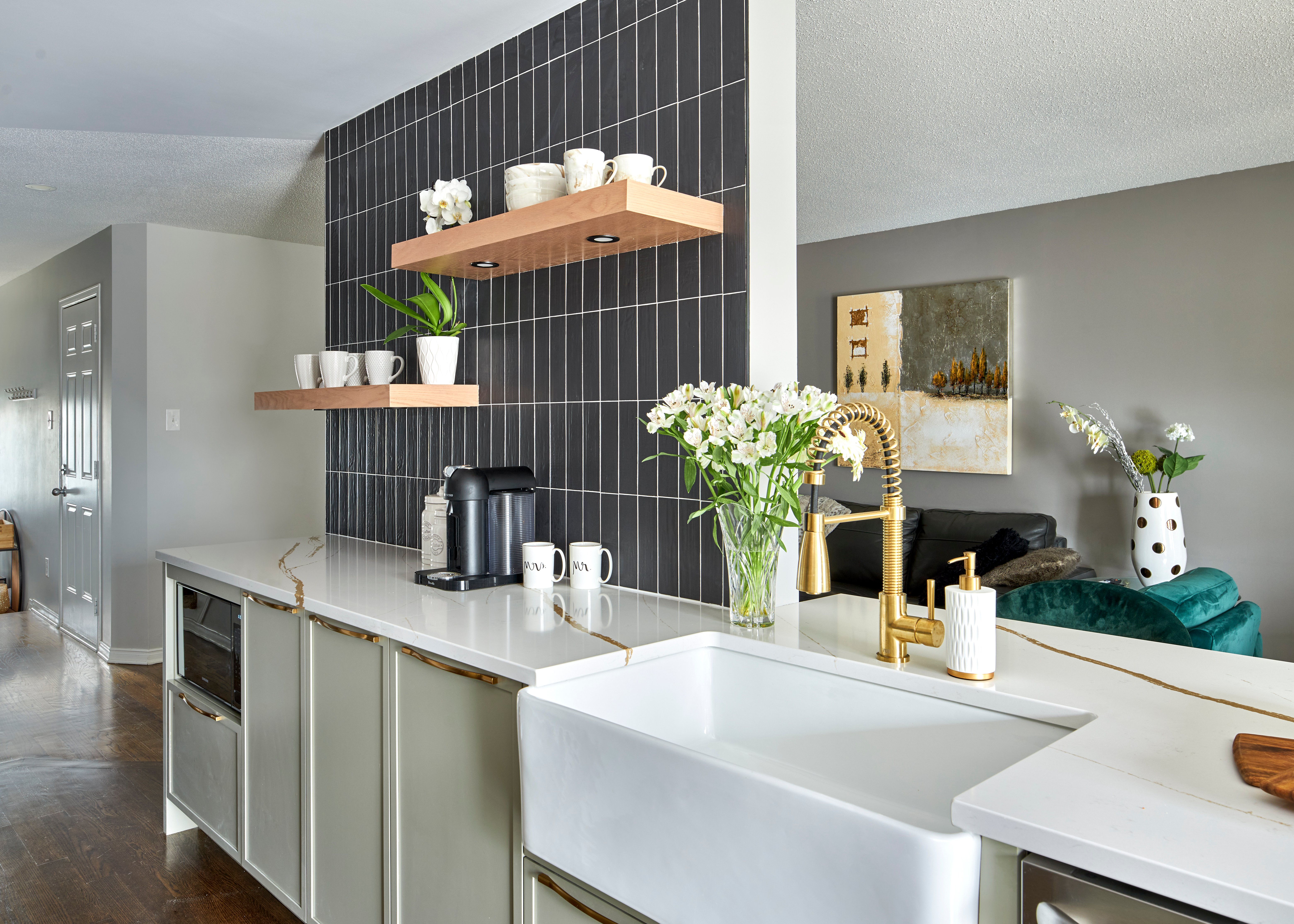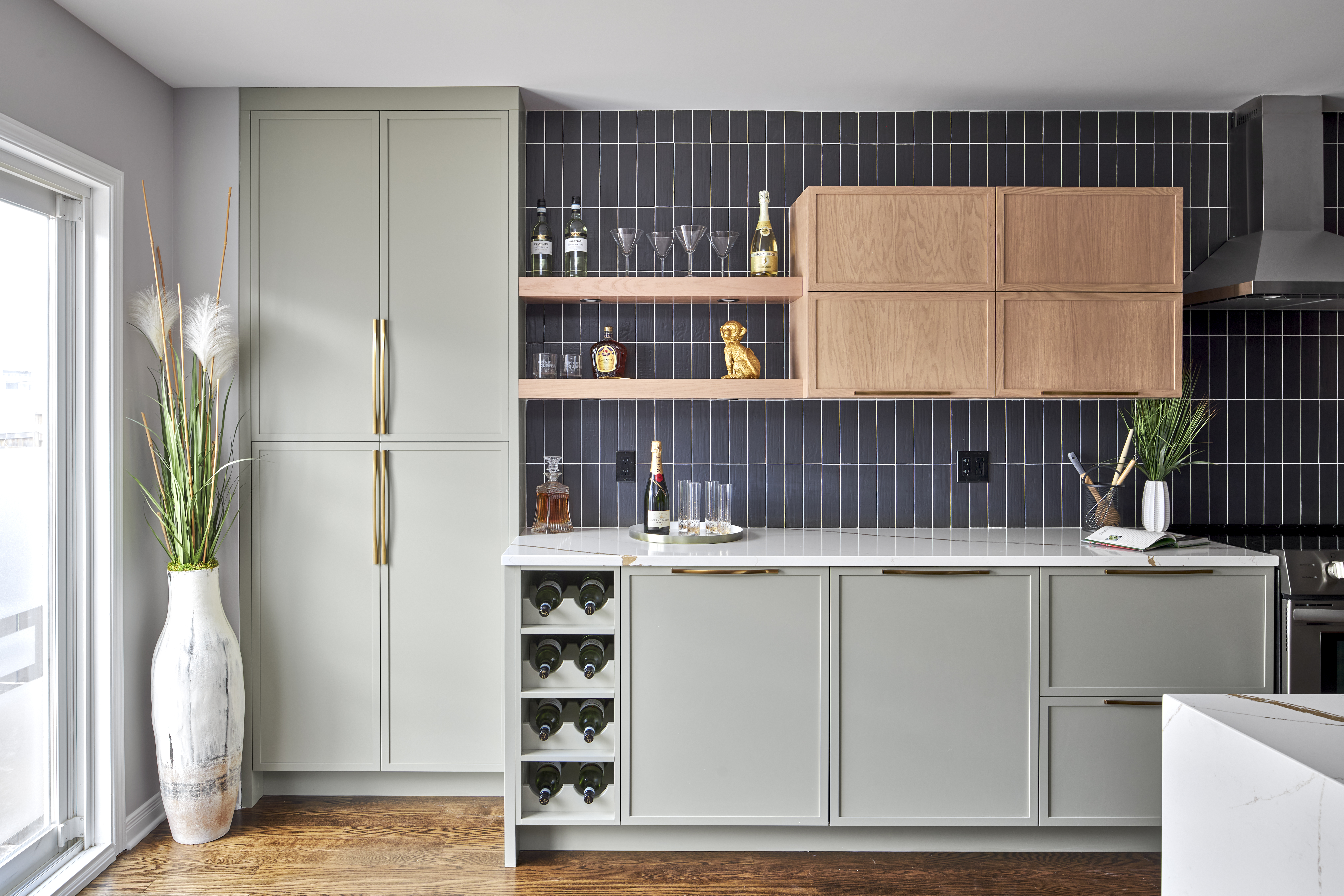 Deslaurier’s new thin shaker Litchfield door style is prominently on display, painted Sage Green in MDF for the base cabinets and stained in Oak for the uppers. Gold hardware by Richelieu adds a touch of glamour and glitz to the lot.