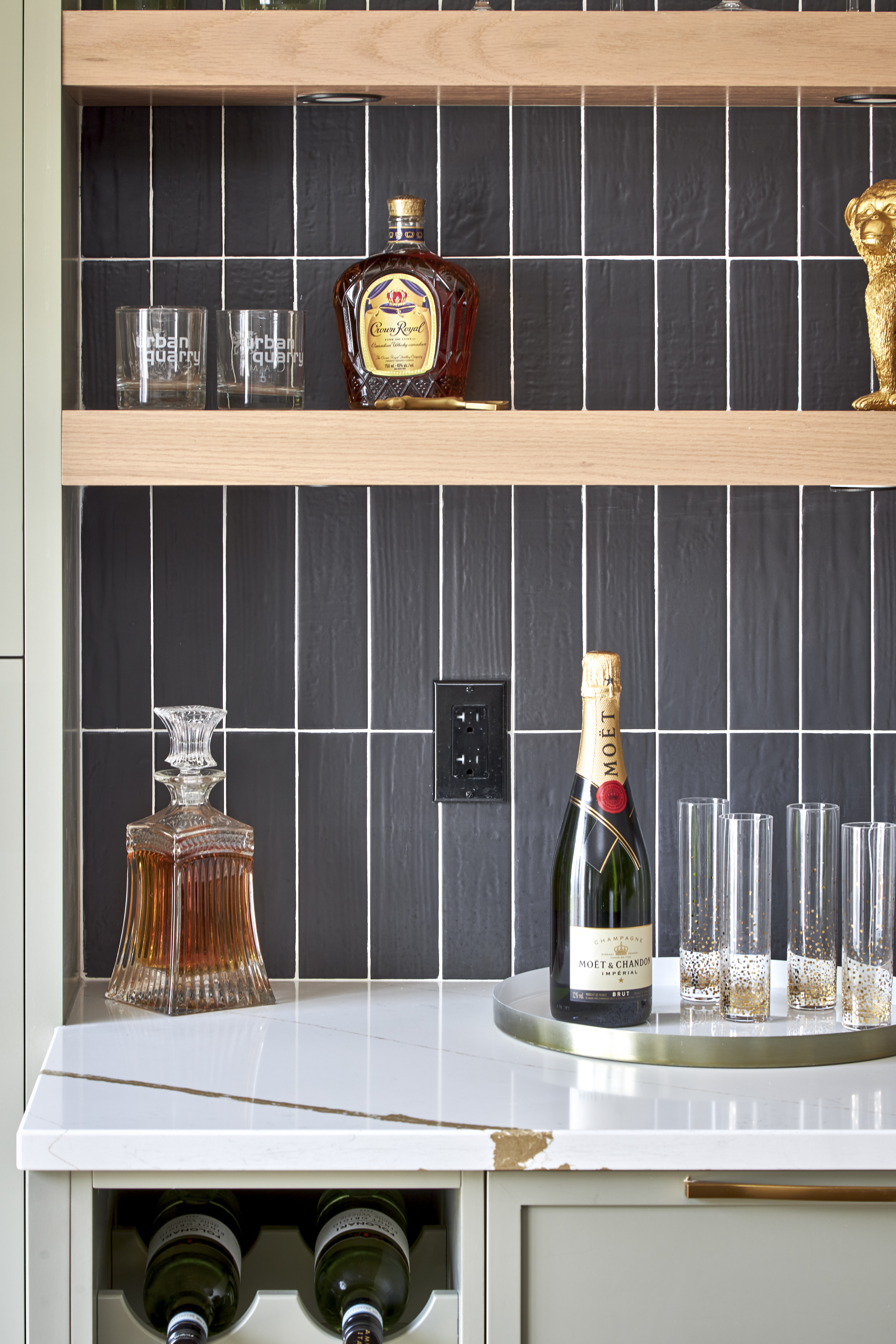 The gold theme continues as a unique golden veining flows through the waterfall-end quartz countertop by Silestone. An apron front sink, wine rack, and floating shelves with undermount lighting are all high-end additions that almost go unnoticed in this wholly customized, candy-store-for-the-eyes kitchen.