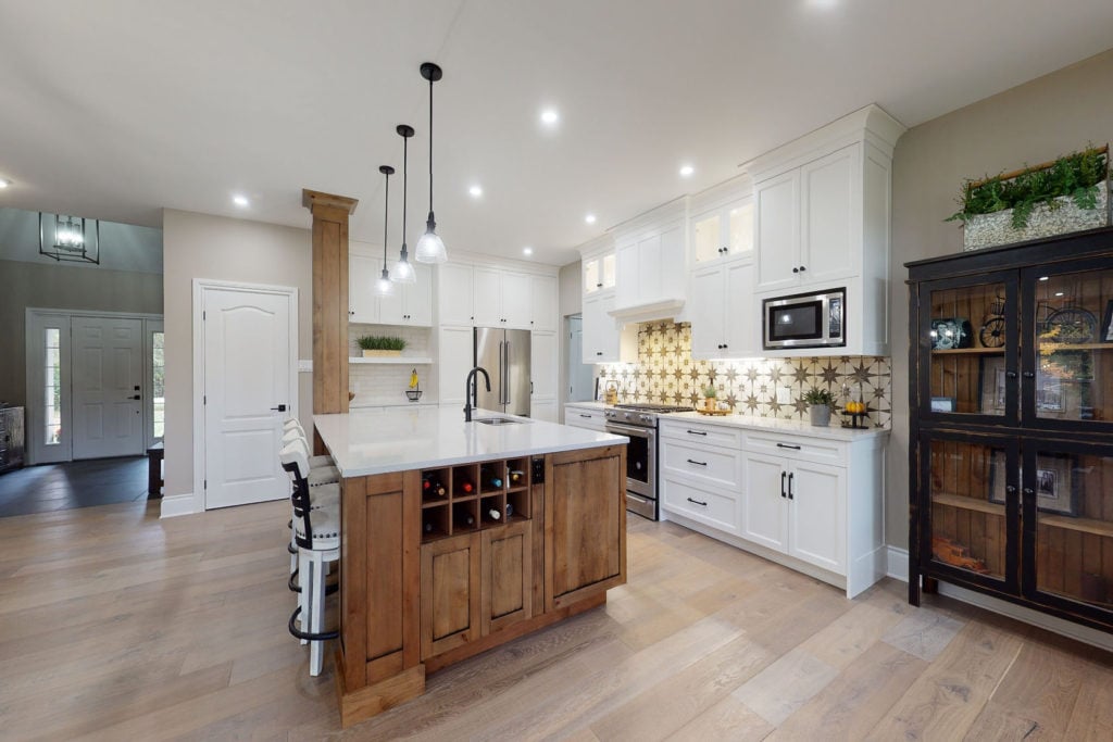 This gorgeous kitchen designed by Vanessa Horwat for Baresite Construction is what Modern Farmhouse dreams are made of. Traditional classic white cabinets are paired with a natural alder wood island finished in a black glaze for that rustic touch. Built-in wine rack, a bold backsplash and open shelving make this space chic and playful.