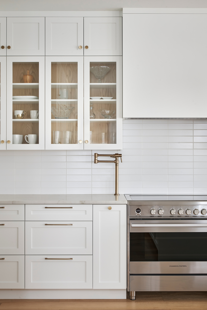 The floating shelves, nook bench top, and interior of the custom glass door cabinets are all elegantly furnished from “Nordik” stained oak and ornamented with a subtle, low sheen, harmonizing the space at every turn.